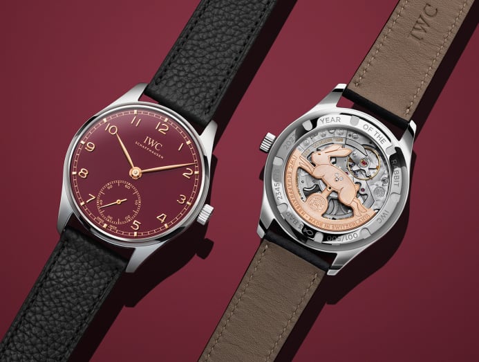 Limited to 500 pieces, the IWC Schaffhausen Portugieser Automatic 40 Edition Chinese New Year watch features a subtly festive dial in burgundy adorned with gold-plated hands and appliques. Flip over the watch and a gold-plated rotor in the shape of a rabbit is revealed, leaping over a sapphire glass case back. This special edition Portugieser is powered by IWC’s in-house manufactured 82200 Calibre comprised of 190 components and 31 jewels.