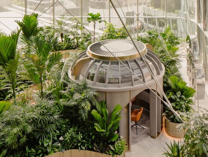 Biophilia in workplace design is not new, but few push it to the extreme. Granted, the concept here is in part possible because of the architecture’s ample, multi-faceted glass facades that flush the interiors with natural light, Seah commented.