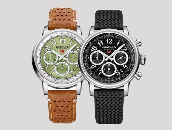 Following the year’s trend for smaller case sizes, these new chronographs are just 40.5mm (the collection’s existing models range from 42mm to 44mm). Also worth noting this the fact that these chronographs employ Chopard’s exclusive Lucent Steel, an alloy that is 50 percent harder than conventional steel and responsibly produced with 80 percent recycled content.
