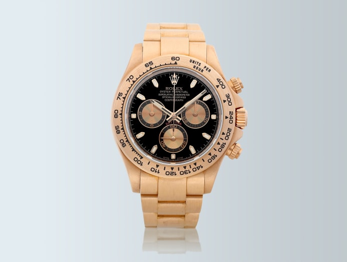 Among these are a Daytona Ref 116505 in Everose gold circa 2013 (US$26,000 to US$38,000), a Daytona Ref 116520 in stainless steel circa 2005 (US$13,000 to US$19,000), and a yellow gold Daytona Ref 16520 circa 1988 that has the curious feature of a suspended logo, where the “Cosmograph” name is printed just a little lower compared to the current editions. This piece has an estimate of US$41,000 to US$64,000.