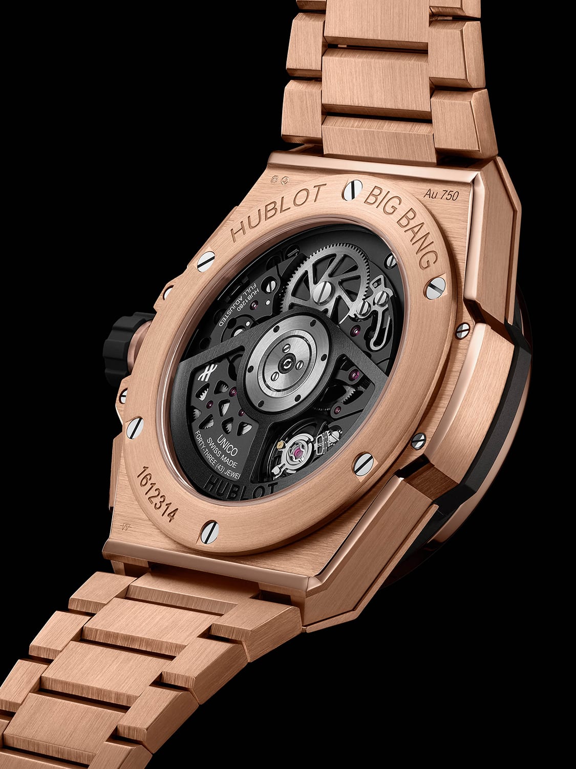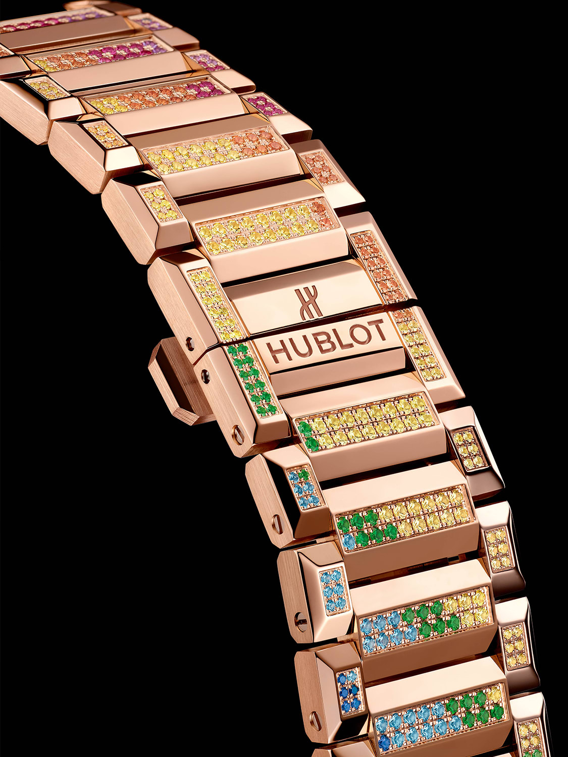 Such cheerful effervescence comes from toilsome work, not just from the time it takes to set all the stones at the exact same height and angle but also from sourcing them. The stones have to be fastidiously selected for colour and size in order to achieve a smooth gradation from the bezel to the lugs and then each individual link. For both watches, the indexes are coloured to match the bezel, while the hands remain white. Legibility isn’t an issue as they pop against black, open-worked movements. For the Big Bang Unico Integrated Rainbow, that would be the Unico MHUB1280 self-winding column wheel chronograph movement with a power reserve of three days, while the Big Bang Integrated Time Only Rainbow is powered by the automatic MHUB1710 which, despite the watch name, offers a date display at 6 o’clock. It has a power reserve of 50 hours, water resistance of 100m and a surprisingly slim profile of 9.25mm.