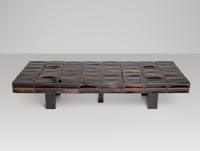 Coffee table ‘Comme un Lego’, Porcelain, Tenmoku block and wood, 670 x 1760 x 380 mm, 2023