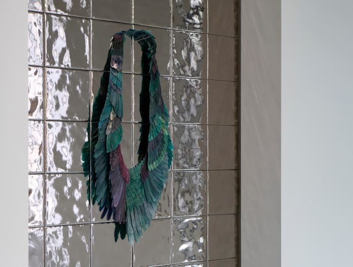 Wings of the Blue Bird, cow’s small intestines, thread and ink, 320 x 610 x 35 mm, 2019