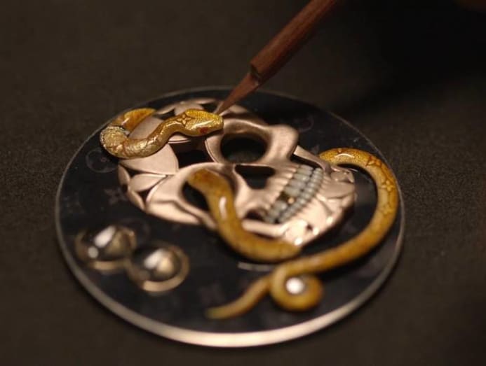 Engraving was handled by Dick Steenman, managing director of Art&D, a Geneva-based workshop dedicated to fine watch crafts with clients including Piaget and Van’t Hoff. The snake, skull and hour glass have been painstakingly carved out of gold, with the latter two decorated with Louis Vuitton’s signature emblems.
