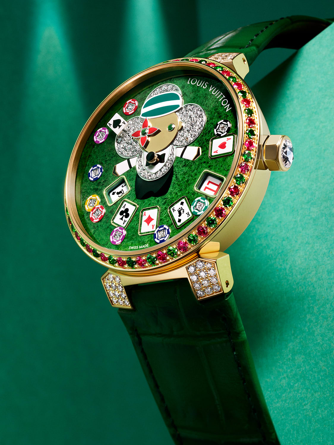 Each version is an exercise in gaiety. In the Casino, Vivienne is dressed as a croupier, surrounded by colourful diamond-studded chips and set against a dial made of skarn, a vibrant green mineral chosen to match the colour of casino tables. The yellow gold case is ringed with tsavorites and rubies, while the lugs are set with white diamonds.