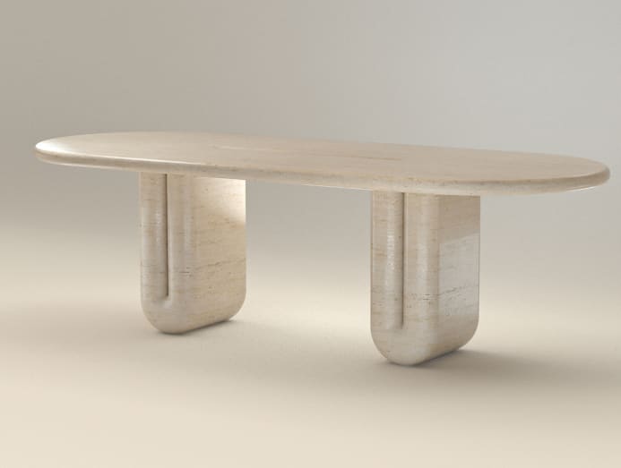 The Chubby table’s playful, poufy form with folded profiles belies its exquisite craftsmanship. This particular piece of sculpted stone is made from Navona Travertine. The table is also available in Lava stone and Pietra di Medici (a beige limestone).