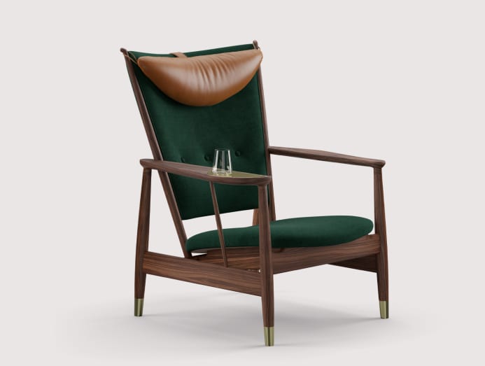 When first shown at the Cabinetmakers’ Guild Exhibition in 1948 as part of Finn Juhl’s ‘The Living Room of an Art Collector’ concept, the Whisky Chair was not put into production. It was re-launched in 2022 under the House of Finn Juhl. Crafted in American walnut timber with a leather or upholstered seat, it features a handmade brass tray and brass feet.
