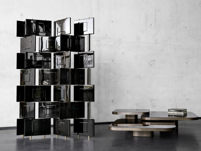 One of the pieces is this bookshelf designed by Roberto Lazzeroni. It comprises Ash wood frames and shaded bronze finish details. Upon request, a marble or black-painted glass top can be inserted inside the shelf frames for a more elegant profile. It comes in two or four tiers, and is available at Proof Living.