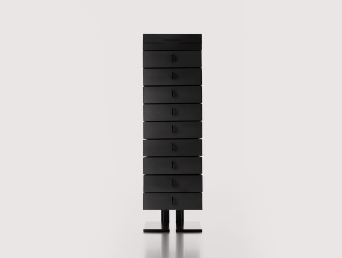 The nine overlapping drawers are connected to each other with a metallic supporting structure, resulting in its column-like profile. The top part can open up to become a writing desk, making this a multifunctional piece that takes up little space when not in use. Available from Made & Make Studio.
