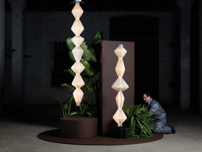 On the website of Switzerland-based trans-disciplinary design studio atelier oï, the Oïphorique lamp falls under the categories of ‘dancing, scenography, installation, material manipulation, moving, textile, expansion, light, breathing, sculptural’. Designed for Spanish lighting brand Parachilna, it is more than just a luminaire. The elegant pleated textile diffusers on a steel structure start to move accordion-like when switched on.
