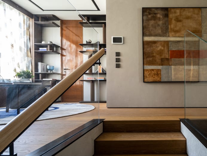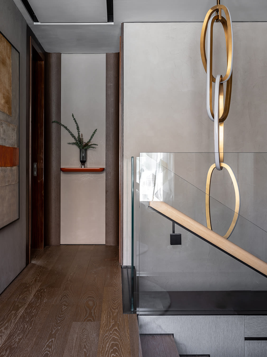 It was conceptualised as a piece of art installation, Ho highlighted. The artistic ambience continues upstairs, where a lightly stuccoed wall becomes the backdrop for artwork. In a small sliver of wall between the doors of the two bedrooms, Ho inserted a slim, orange lacquered shelf that becomes a stage for a petite floral arrangement, flanked by curved timber walls and accented by ambient illumination.