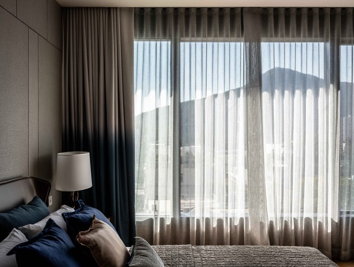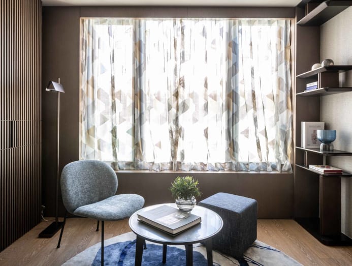 The master bedroom also boasts abundant textures. Among dark timber walls and earth-toned fabrics, a panel of backlit, monochromatic wall with geometric prints adds interest to the vertical surfaces. Ho highlighted that it was intended to bring a dose of exuberance into the space. The blue ombre curtain does that as well, while a bamboo silk rug adds softness to the timber floors.