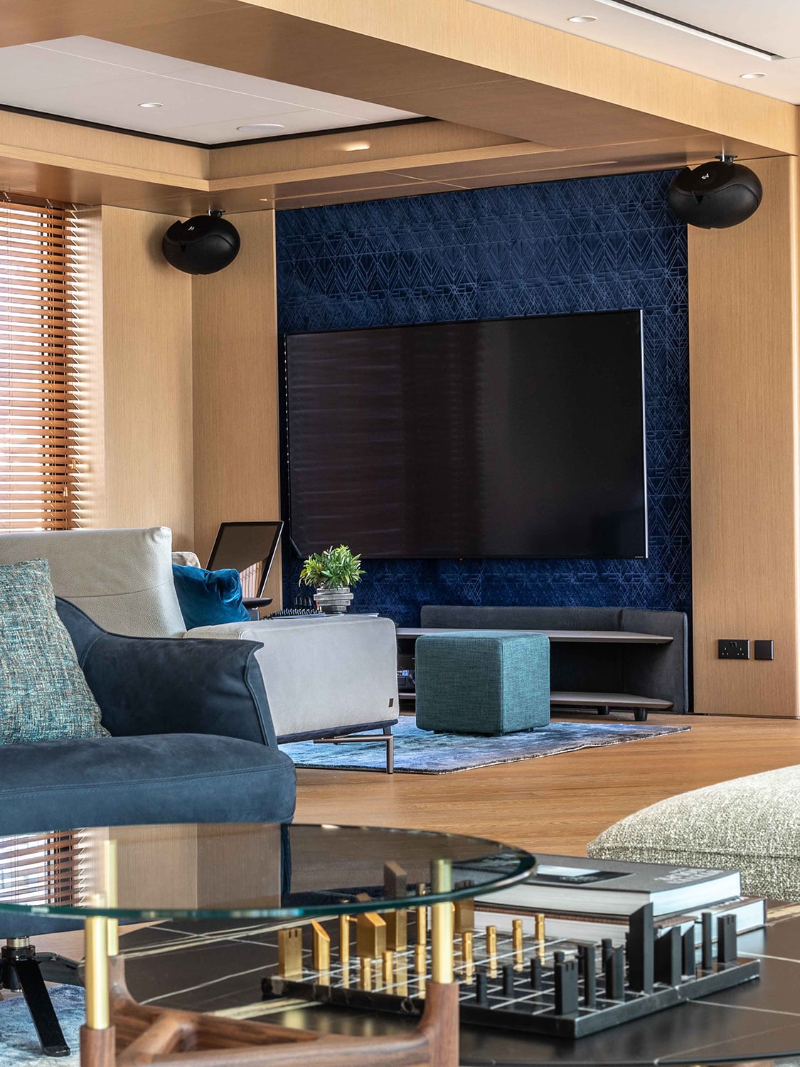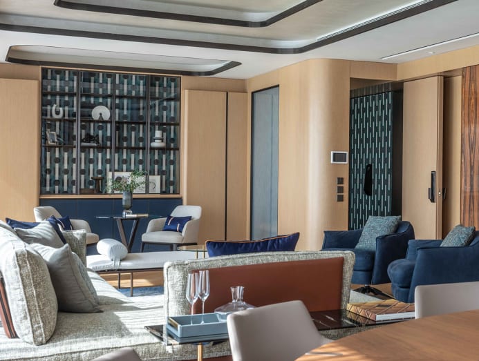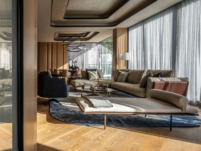 In the common area, the palette comprises beige and brown, with spots of cobalt and navy in the furnishing and joinery. They mimic the colours of nature and sky from outside the expansive windows. In one corner is the dining area, anchored by a round, 10-seater walnut timber dining table from Giorgetti. Behind it, walls are detailed as with repetitive profiles and wrapped oak timber veneer, giving the surface a three-dimensional effect.