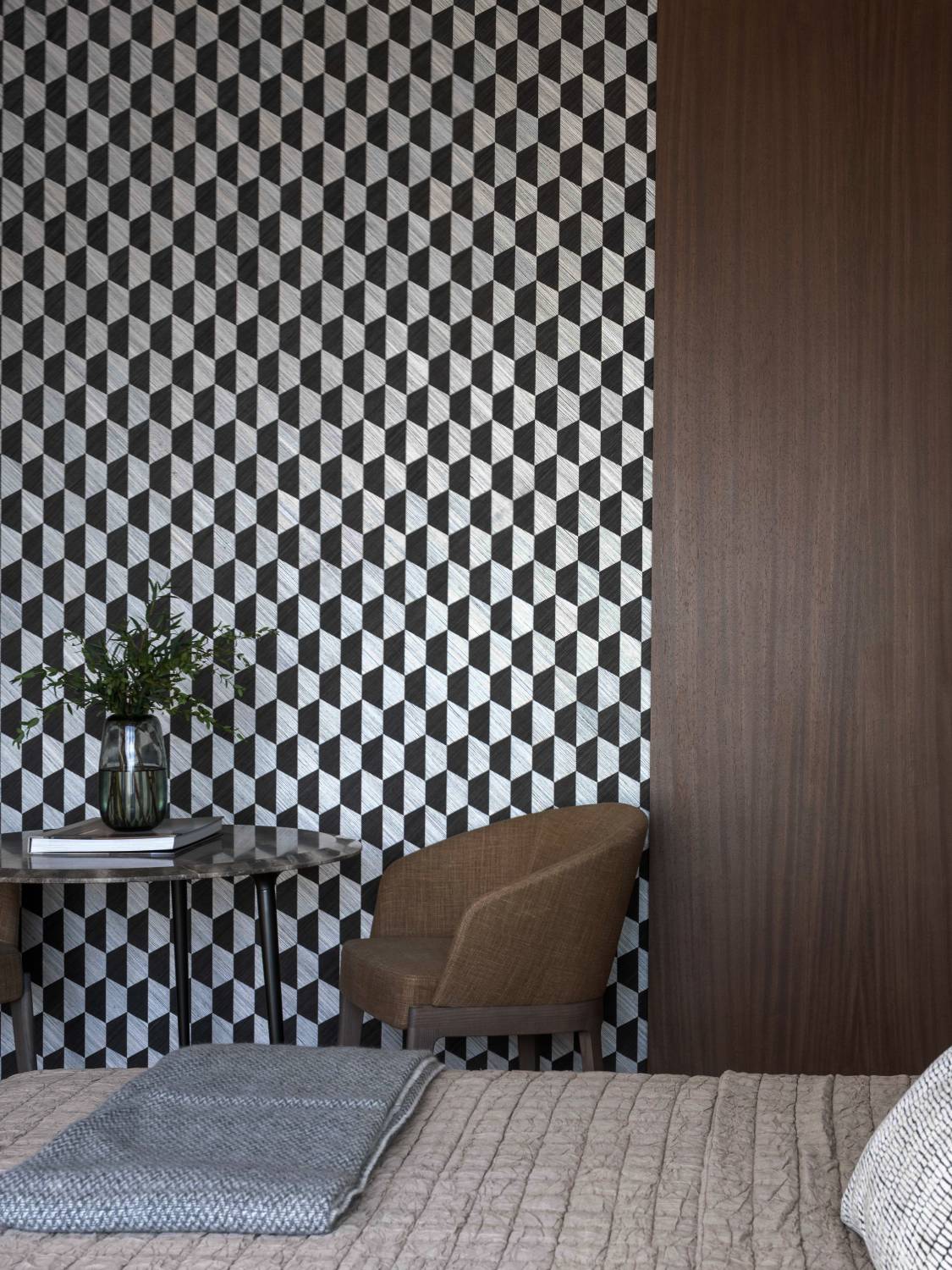 The geometric print is seen again inside the common area, as the backing of a bespoke glass cabinet to display artful paraphernalia. In front of it, two plush armchairs and a small glass table define an informal sitting area.