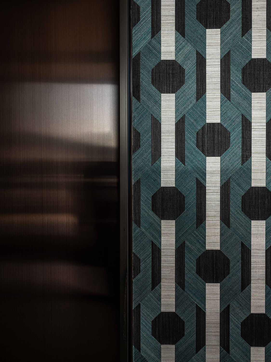 At the private lift lobby, geometric green, black and ivory wallpaper make a refreshing and bold first statement. The design team inserted a fabric-laminated glass screen between this zone and the common areas to diffuse daylight into the originally dark space.