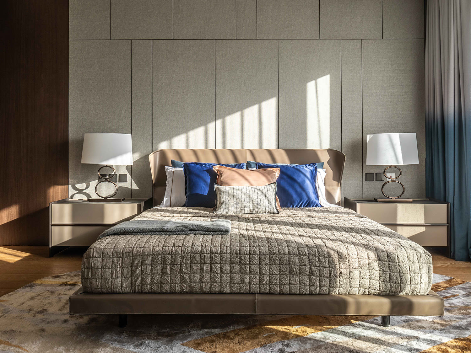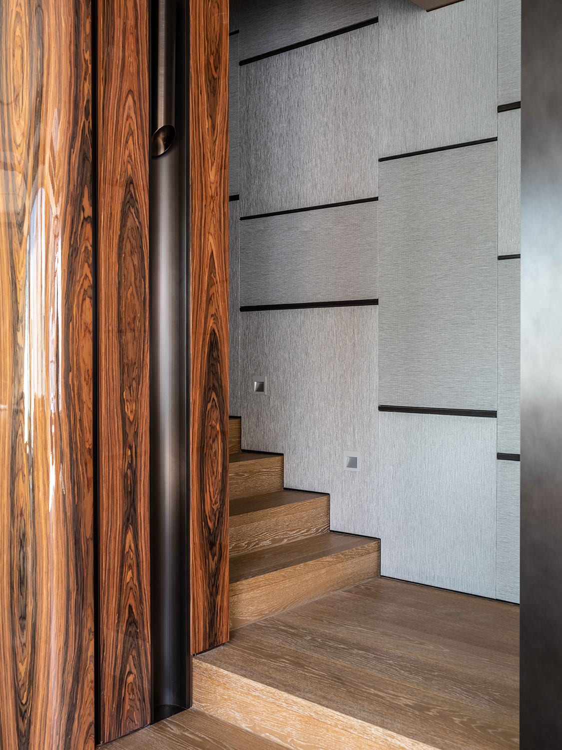 Like in a high-end hotel, there are plentiful luxurious touches in the apartment but they are designed for everyday comfort rather than as showpieces. Finesse comes in the careful deliberation of materials as well as the painstakingly designed details that extend to doorway thresholds and cabinetry profiles.
