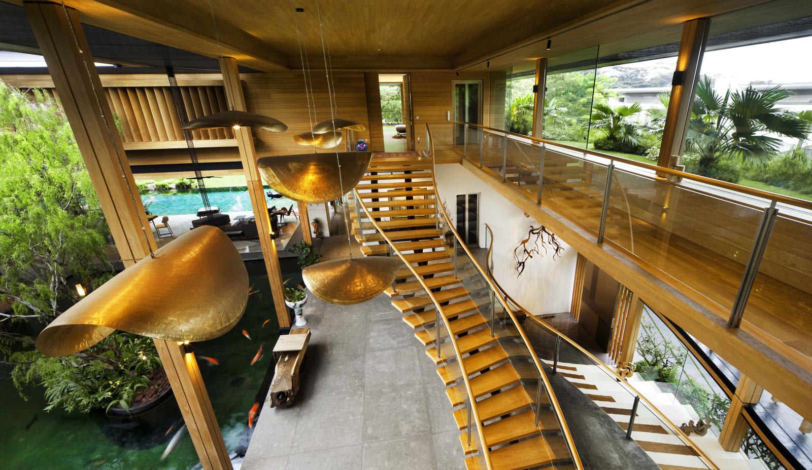 The living areas are conceived as pavilions set around water courtyards. The design allows airflow, and the water features cool the house, keeping it comfortable in the tropical heat and humidity. It also creates a feeling of openness.