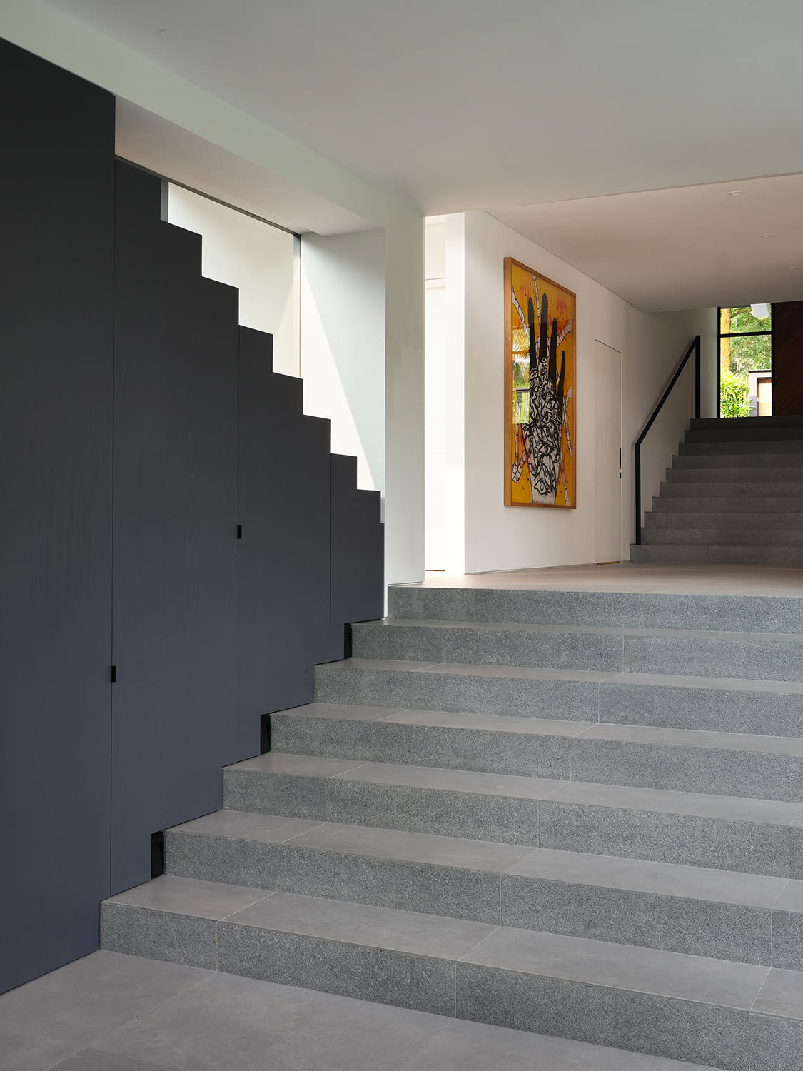 Tay also wove in some quiet drama. Through the front door, large steps lead down from the foyer ceremonially toward a large landing. This fans off to the living room on one side, the enclosed granny’s room on the other, and the dining room in front, accessed via a second flight of steps.
