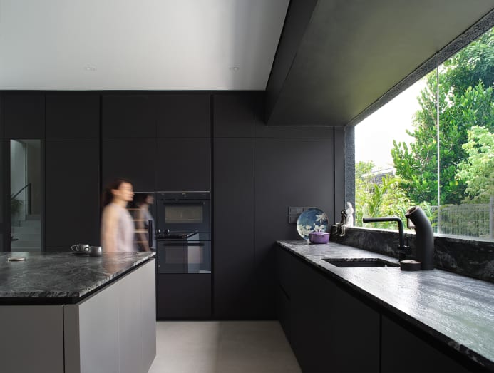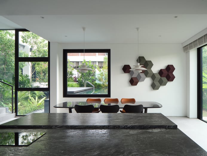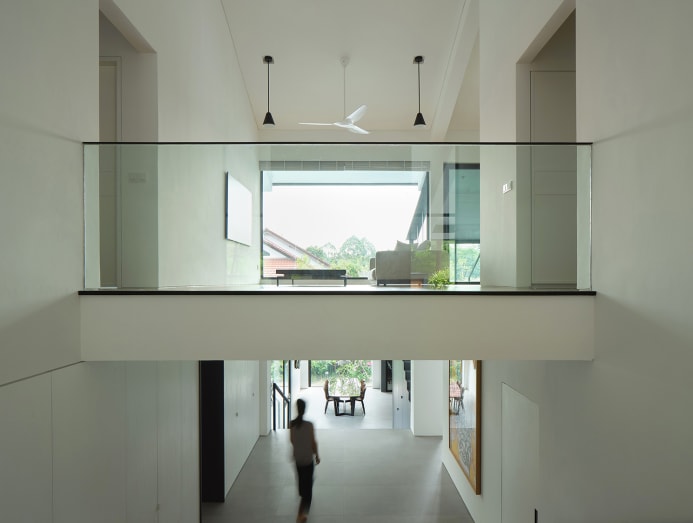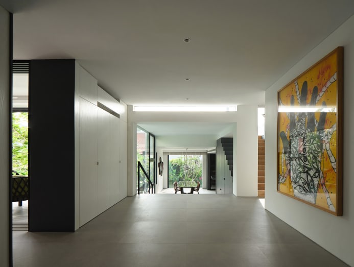 Tay explained: “This hallway was many things to us – a central spine that traverses the sloping terrain and connects all the first storey common spaces; a gallery, and a place to linger before and after a dinner party.” It is also a “void space” – a visual and spatial breather to the different functions.