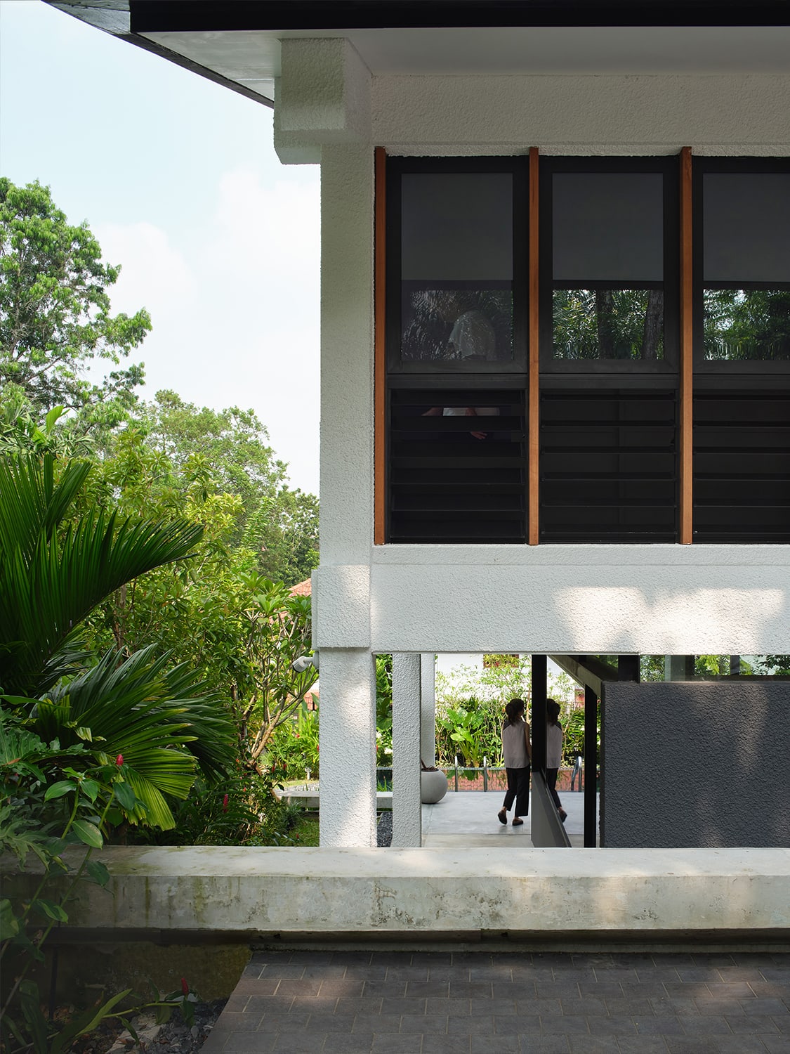 This relaxed image reminds me of traditional kampong dwellings, designed to function for comfort amid the tropic’s scorching sun and rainfall. This house’s uncomplicated architecture, with its clear expression of roof, and a post-and-beam structure in-filled with louvre windows, easily pays homage to the vernacular precedent.