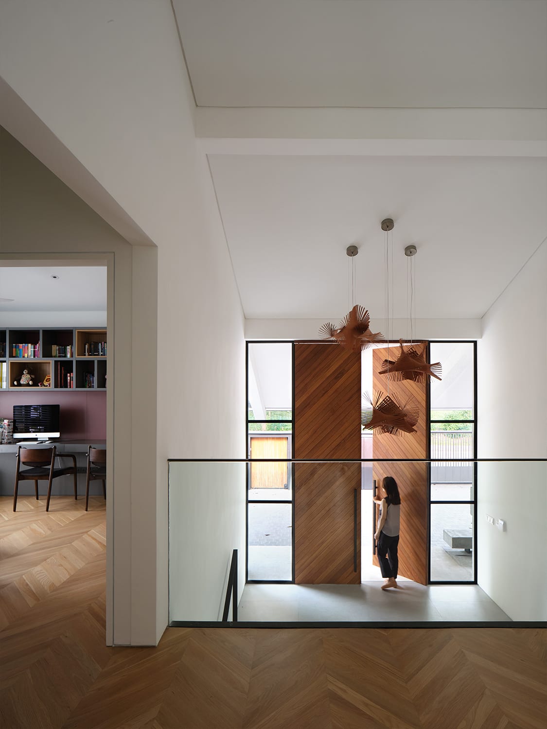 The entire elevation was opened up as much as possible with glass walls and windows. For example, large windows at the front and back allows one to see right through the house. On the second storey, the planning takes a page from colonial bungalows. Tay set back the children’s bedrooms that front the road to create a little walkway for privacy. Eschewing typical doors, large sliding panels open the sleeping areas to the corridor where louvred windows allow the option of wind.