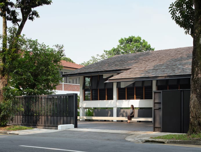 As I drive up to this house in Bukit Timah, its front gate has been slid open. Architect Alan Tay, co-founder of Formwerzk Architects, is sitting on a long, low concrete bench looking out for me. Above him, the roof dips low, extending into a car porch canopy that provides shade together with the outspread cover of matured roadside trees.