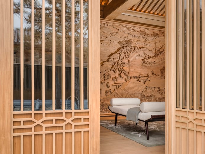 In the tea pavilion where there is a lounge setting for the enjoyment of tea drinking, Tan customised a dramatic eight-metre-long backdrop featuring an elaborate timber carving inspired by the handscroll painting Along the River During the Qingming Festival by famous Song Dynasty painter Zhang Zeduan. “Tea can be savoured in the lounge area or within the tea booth seating where another specially commissioned Chinese watercolour painting artwork is juxtaposed with a display of teacups sourced from all over the world,” she pointed out.