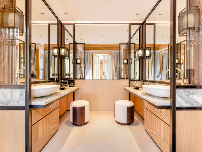 Private areas like the bedrooms are dressed in warmer hues. In the massage room, peach tones match the embroidered blossoms on the silk wallpaper while in the master bedroom, the same shade of peach matches the butterflies on the room’s folding screens.