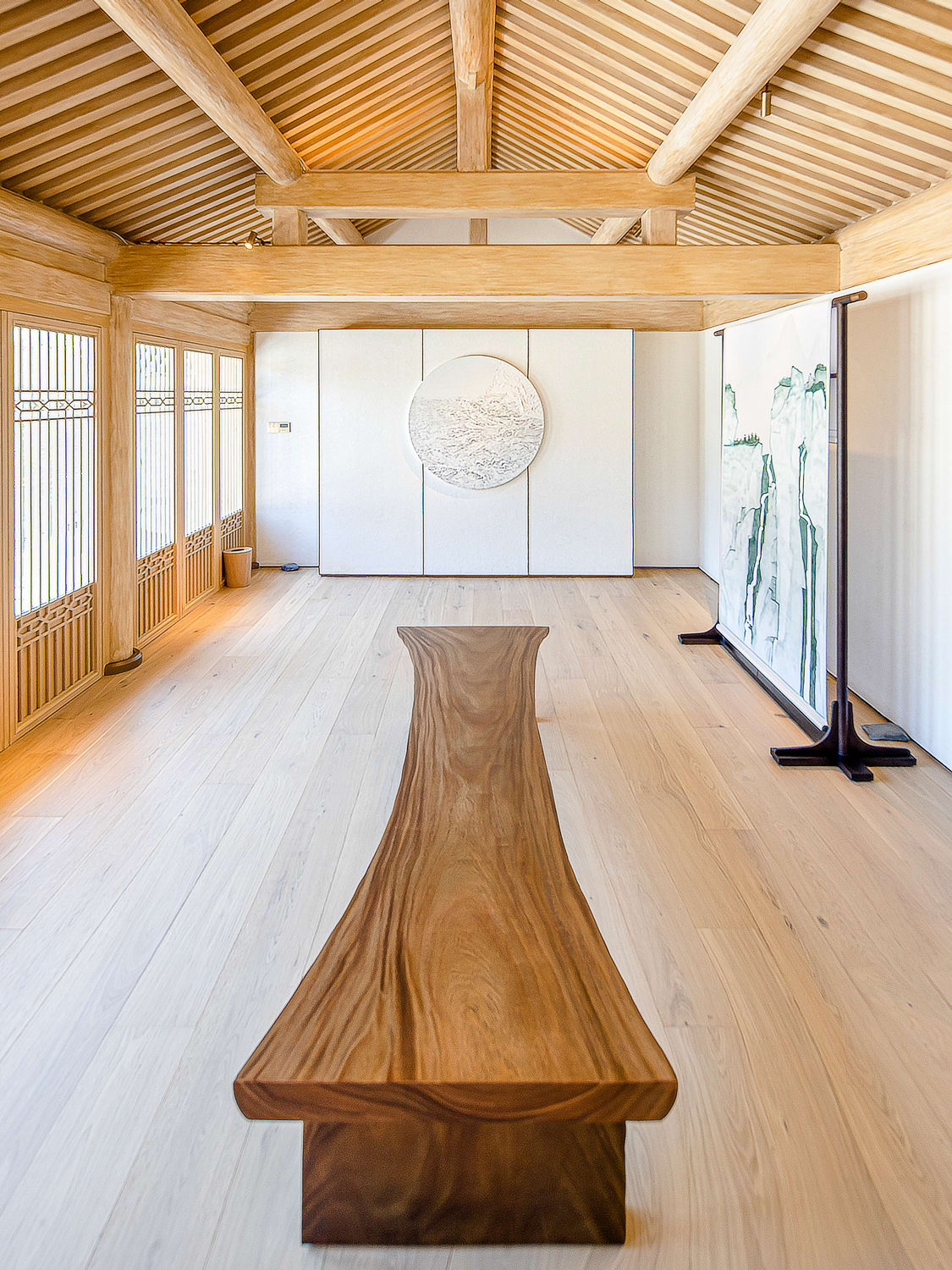 A tearoom, sunken courtyards, silk wallpaper and an eight-metre-long timber carving made by 40 artisans are some highlights in this traditional courtyard house.
