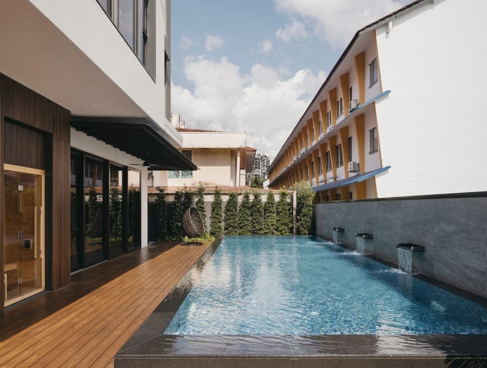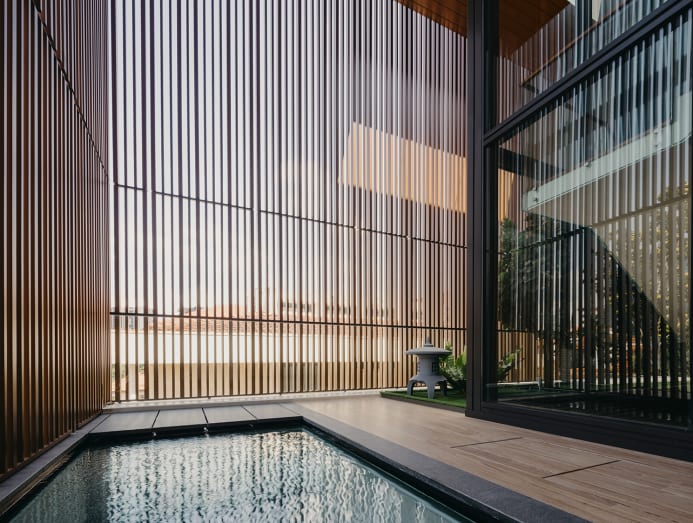 The children’s friends often come by for a game before soaking in the swimming pool and using sauna at the back of the house, and then heading up to the entertainment area at the attic for more indoor fun, she elaborated. The sauna faces the pool, making this area a sort of private wellness enclave. The pool was positioned here as it backs the gardens of an institution, thus there are no neighbouring houses that look directly down at this capacious backyard.