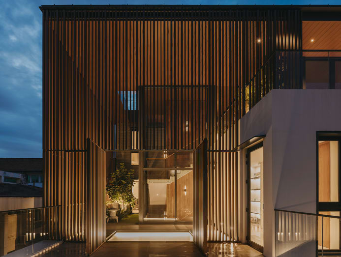This internal courtyard is the house’s centrepiece, as well as a climatic buffer to the building’s inner recesses. “This elevated garden, cocooned by the skin of screens, not only lends privacy but also filters natural light and gentle breezes to create a comfortable microclimate for the family,” Chow explained.