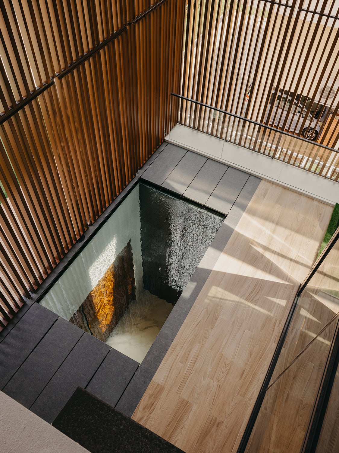 Internally, the staggered volumes help foster visual connection between the different zones. For example, the entertainment space on the attic level looks down into the double-storey, landscaped internal courtyard on the second storey, while a small pond with a glass base in the courtyard offers glimpse of what’s happening on the first storey foyer.