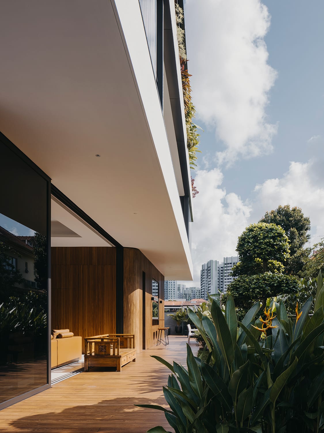 The architecture also caters for passive cooling. “Water features, such as entrance waterfall features, swimming pool spouts and the reflection pool in the courtyard naturally cool the outdoor spaces without additional mechanical systems,” Chow explained. Lush landscaping at the attic also provides shade and privacy for the interiors on that level.
