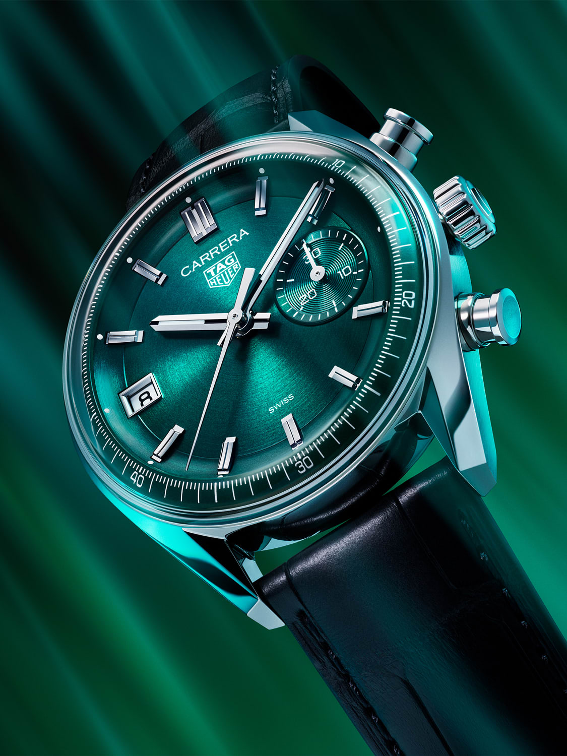 Also dressed in the same striking hue, the 42mm Tag Heuer Carrera Chronograph Tourbillon at 6 o’clock features a tourbillon cage encased in a glass frame. The teal green flange, rhodium-plated applied indexes, and deep azure subdials surrounded by green rings, add flourish to the watch’s elegance. The curved Glassbox enhances the watch’s aesthetic appeal ̶ the tourbillon and dial layout can also been seen from various angles. At the heart of the timepiece is the TH20-09 calibre, created by Tag Heuer Movements Director Carole Forestier-Kasapi and the Swiss watchmaker’s technical teams. And like the Carrera Chronograph, the watch comes with a black alligator strap.