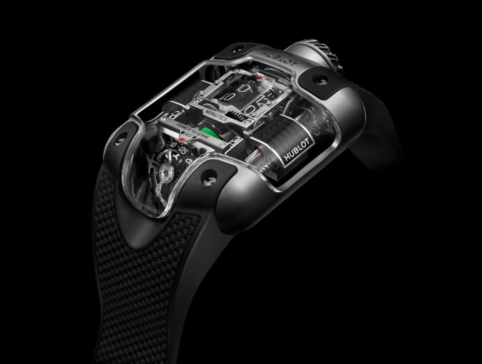 Although complex in looks, the 50-piece limited edition MP-10 is read easily and naturally from top to bottom. Sharing the same white lacquer typography on black aluminium rollers, each indication tells the current time via a red triangular marker. For the winding system, instead of a flat oscillating weight that is used in a conventional automatic watch, Hublot engineers devised the ingenious verticalised HUB9013 movement to fit into the MP-10’s unique construction. Here, it incorporates two blocks of white gold arranged on a vertical axis along which they are free to move. And while the 22.4mm-thick case construction is simple (comprising the middle and caseback in shiny micro-blasted titanium), the sapphire crystal is Hublot's most complex to date as it combines inclined planes on three axes.