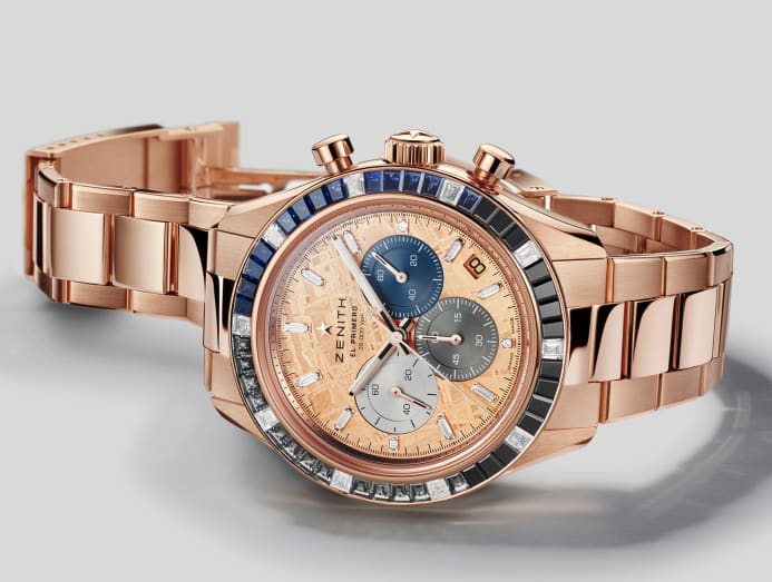 One of two new 41mm Chronomaster Sport additions, the El Primero’s trademark tricolour scheme is elevated here in the line’s first bejewelled iteration. Featuring a radiant rose gold case and bracelet, its flashy bezel flaunts expertly set baguette-cut white diamonds, black spinels, as well as grey and blue sapphires. The dial is just as exquisite: Made from a slab of meteorite, it is hand-finished before it’s swathed in a golden colour that imbues the meteorite’s unique Windmanstaatten pattern with a warm glow. Adding to the complexity of working with the ancient space material, the dial is adorned with baguette-cut diamond hour markers and applied chronograph counters in grey and blue shades. Exclusively available at Zenith online and physical boutiques worldwide, the gem-set watch is powered by the latest El Primero 3600 calibre with an extended power reserve of 60 hours. Its sapphire display back allows one to see the movement’s contemporary architecture that boasts a sleeker, more open design with a blue column wheel and open rotor marked with Zenith’s star logo.