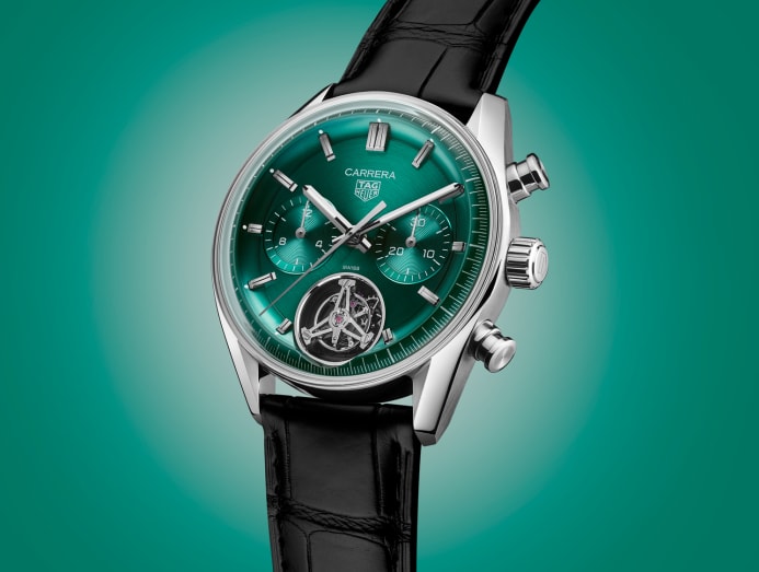 The manufacture kicked off 2024 with two steel timepieces in vivid teal: The Tag Heuer Carrera Chronograph, which is inspired by the iconic Dato layout, and a second iteration with a tourbillon.