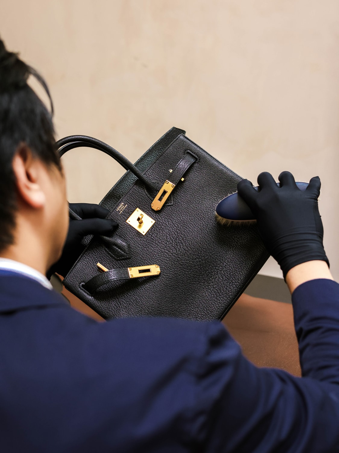 The atelier operates by appointment only. Stepping into the space, clients are first given a private tour of the atelier. The thoughtfully designed space features a neutral colour palette. The second floor features a consultation area, along with an exquisite display of bags. Here, clients are also able to select various types of colours, finishes and hardware for the repair of their bags. The third floor features another VIP consultation area, along with an open concept workshop where clients can witness their bags being restored and recoloured on site.