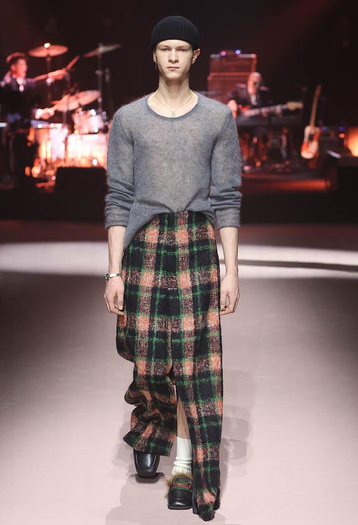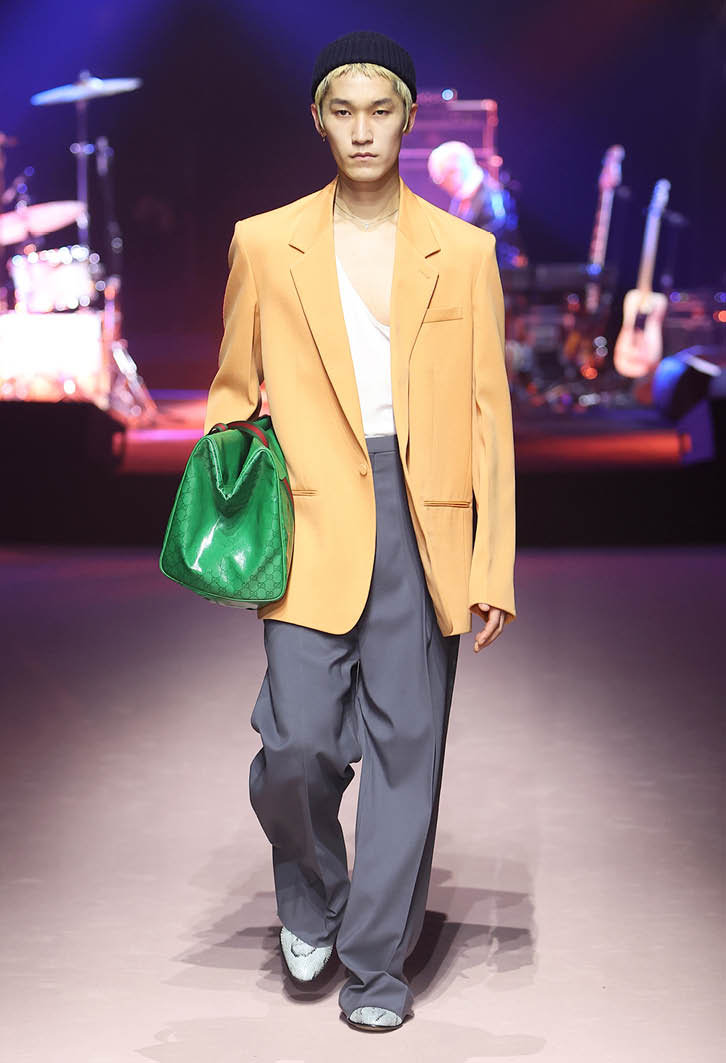 Eyes popped when Gucci unveiled its first collection since Alessandro Michele’s departure from the brand: There was no trace of the maximalist, be-logoed, magpie aesthetic that has come to define the Gucci look since his appointment as creative director in 2015. Designed by the studio, the clothes were literally pale and practical echoes of collections past. Supersized tailoring in preppy pastels and traditional tweeds looked fresh with promise, quite unburdened by the heavy branding emblems and zany baroque decorations as had been the style. Plain tees, distressed and sinuous, sliding on necks and shoulders, underpinned most of the looks, which were shown with classic jeans in leather or 1990s washes – there was even a rugby shirt! – with oversized outerwear. The entire thing was enlivened by some pops of vintage-design bags, boots and a full-length plain wool wrap skirt too sedate for Harry Styles to wear.