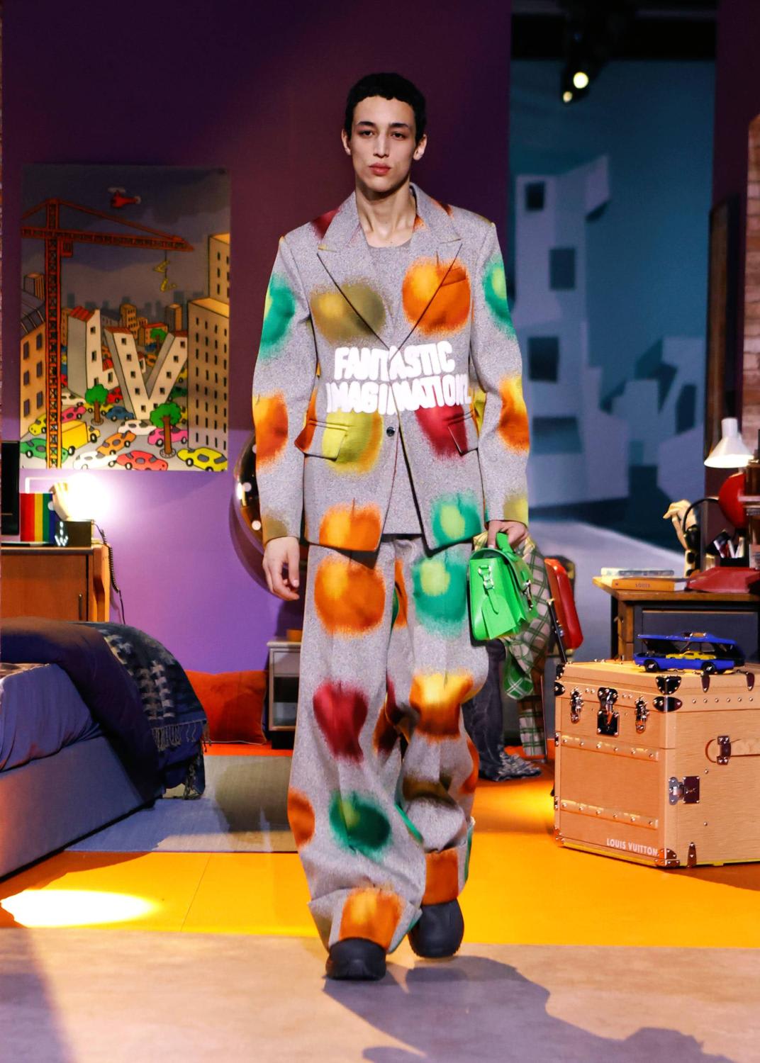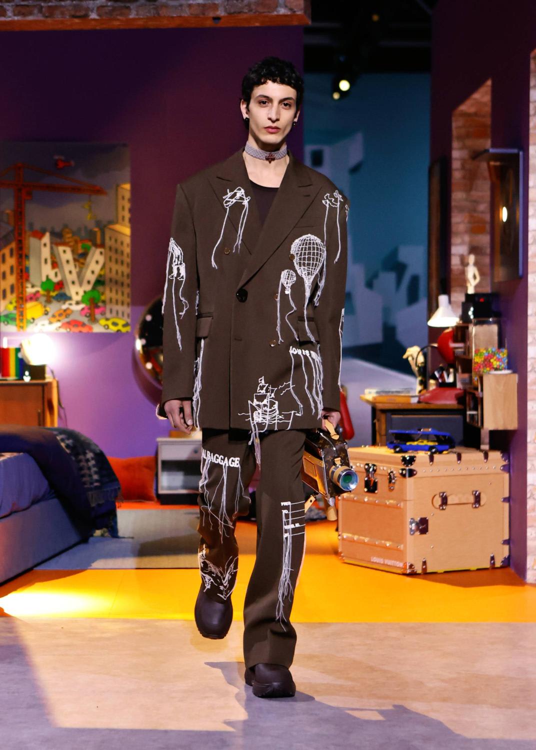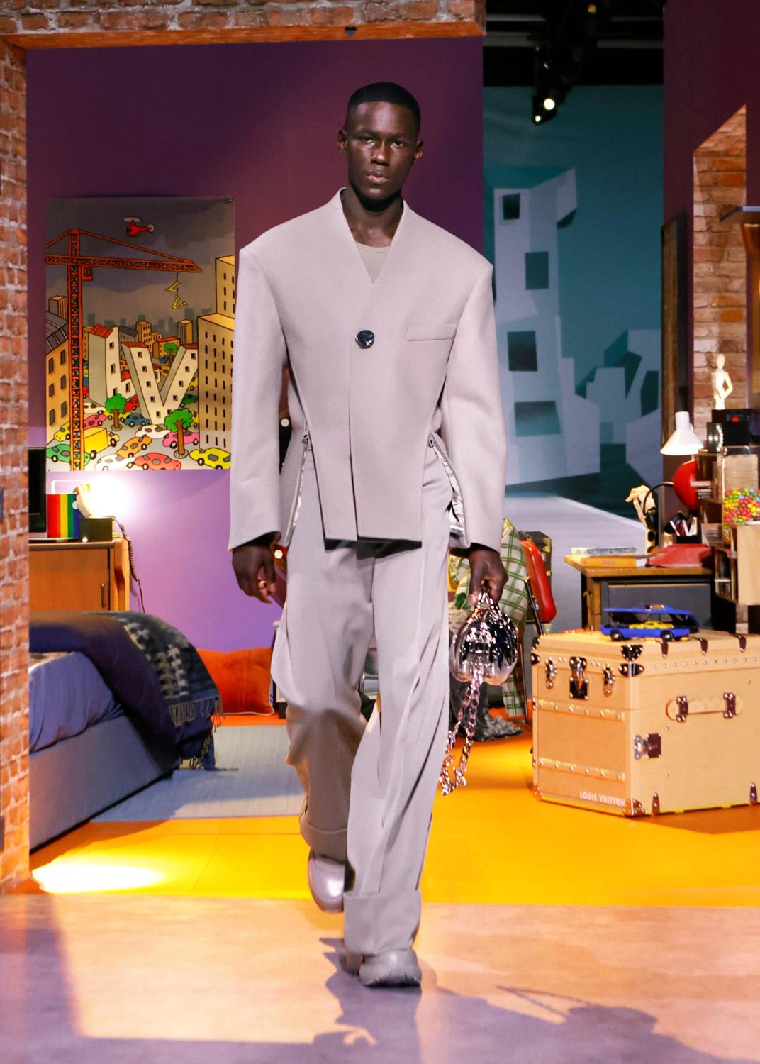 This season unveiled a collaboration with artist Colm Dillane, better known as KidSuper. A playful collection of streetwear was presented in a playhouse, perhaps as an escape from the grim realities of the world, into a world of levity, humour and whimsey. Surreal suits came imprinted with faces; another suit (and matching hat) was stitched with pages of handwritten notes. There were graffiti, collage and camouflage prints with the emphasis on tailoring that was unforced, relaxed and fluid. Important note – the logo accessories were kept to a discreet minimum as much as seemed possible for such a brand, and yes, the bags are there.
