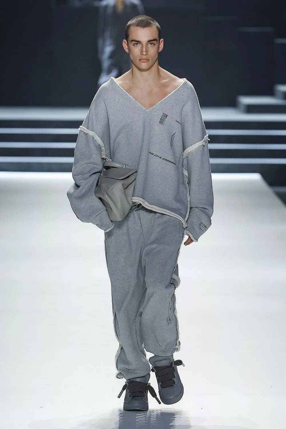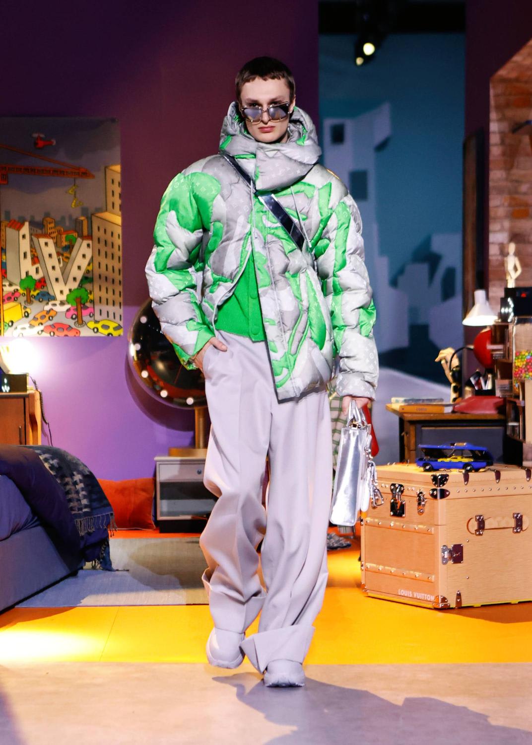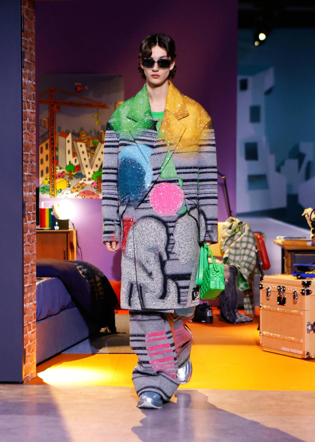 This season unveiled a collaboration with artist Colm Dillane, better known as KidSuper. A playful collection of streetwear was presented in a playhouse, perhaps as an escape from the grim realities of the world, into a world of levity, humour and whimsey. Surreal suits came imprinted with faces; another suit (and matching hat) was stitched with pages of handwritten notes. There were graffiti, collage and camouflage prints with the emphasis on tailoring that was unforced, relaxed and fluid. Important note – the logo accessories were kept to a discreet minimum as much as seemed possible for such a brand, and yes, the bags are there.