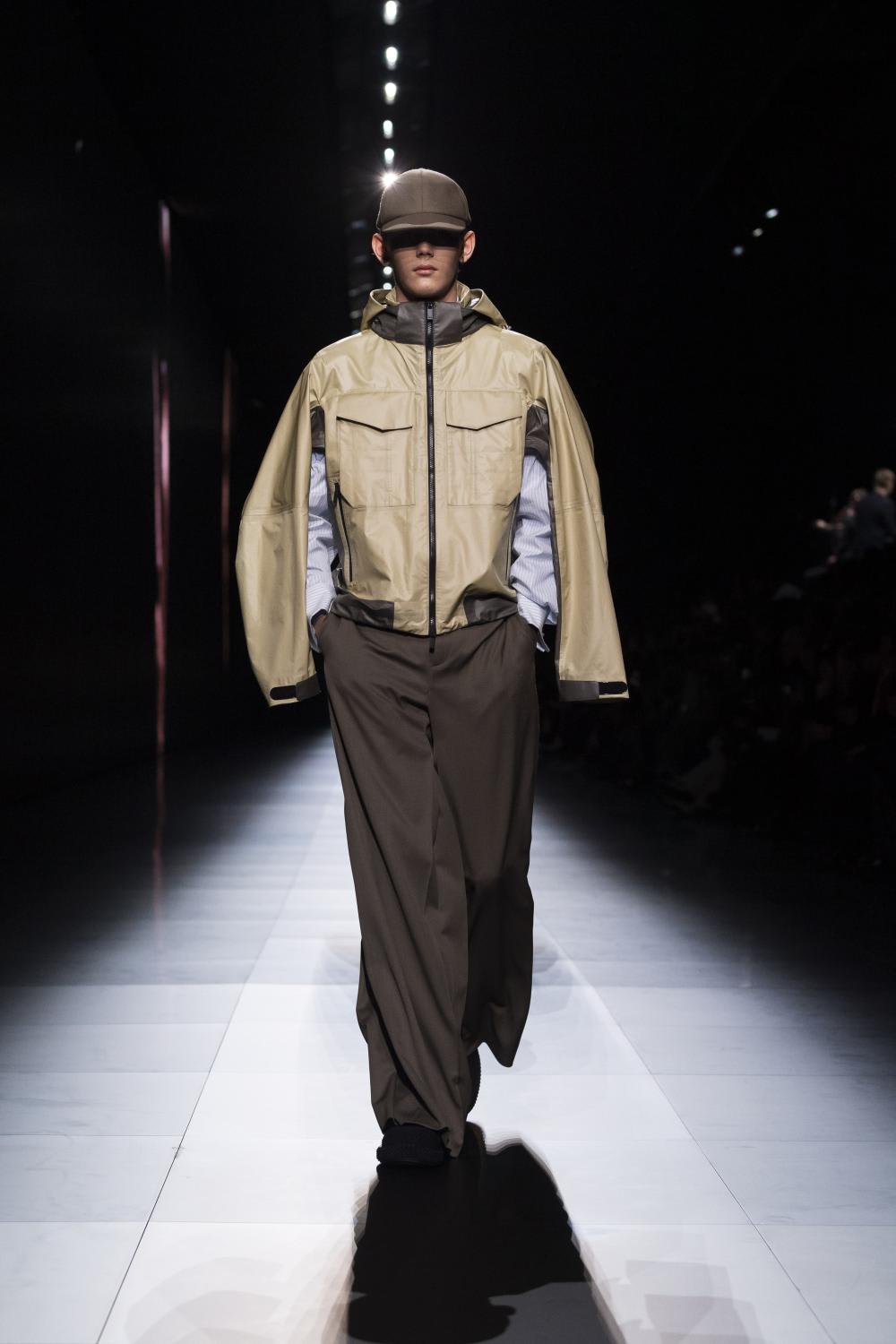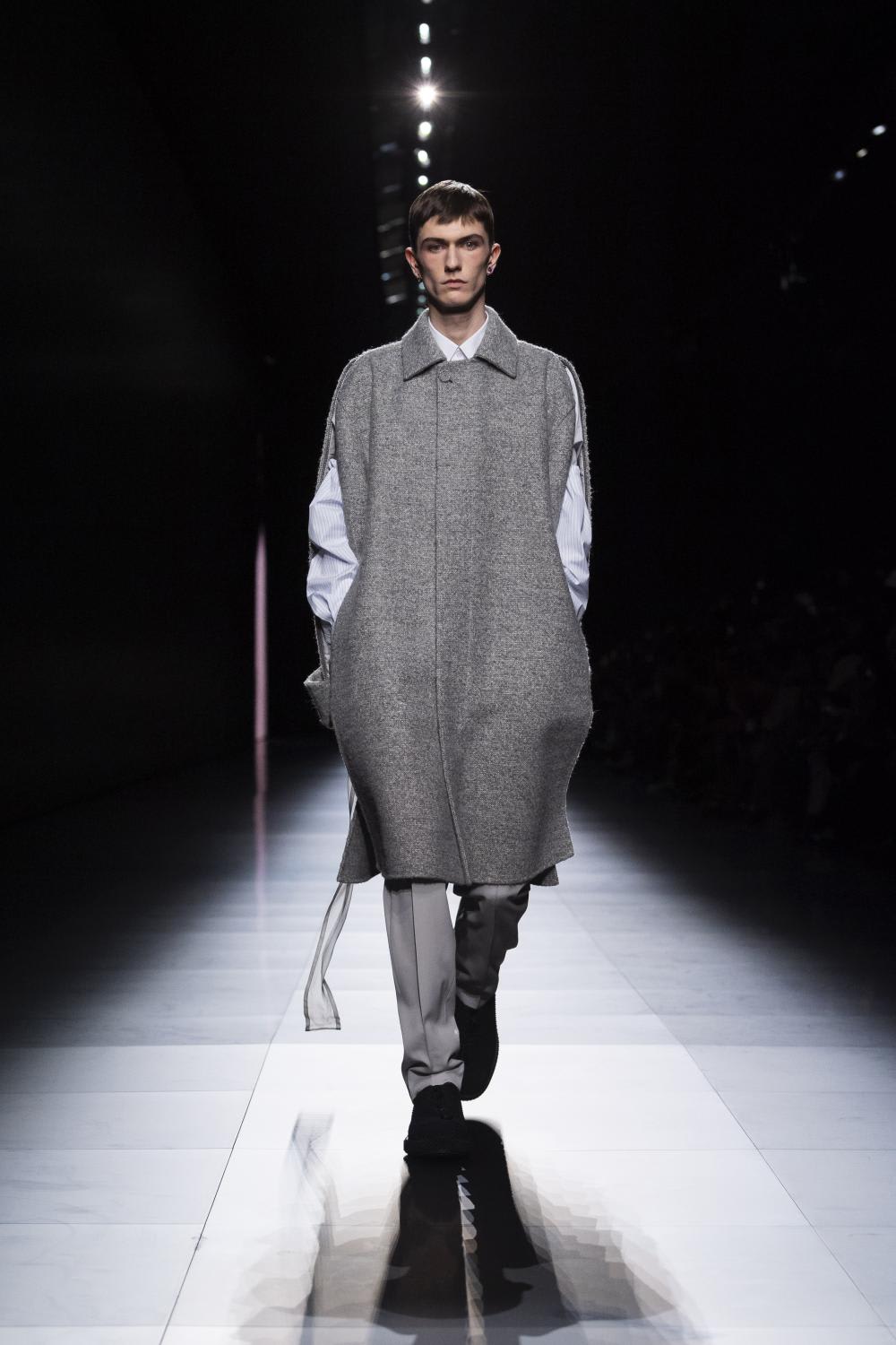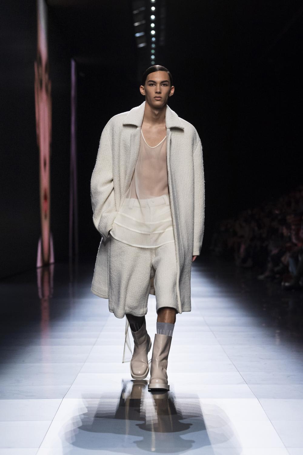 Where’s the famous, instantly recognisable Dior Oblique? Where are the CD logos from hat to heel? With nary an emblem in sight, Kim Jones’ latest menswear collection for Dior collection drew a contemplative, poetic air, transposing the house’s delicate couture tradition into contemporary menswear. The very desirable looks, in a palette of mostly schoolboy whites and creams with a passage of earth tones, featured voluminous tailoring, in sumptuous (if plain) fabrics billowing, a draped asymmetrical jacket here, a wide-cut culotte there; kilts wafted gently, plush sweaters gathered in fluffy piles, coats levitated dreamily as belts and straps and things fluttered sublimely. This is a tender, wearable and classic collection that is designed to stand the test of time.
