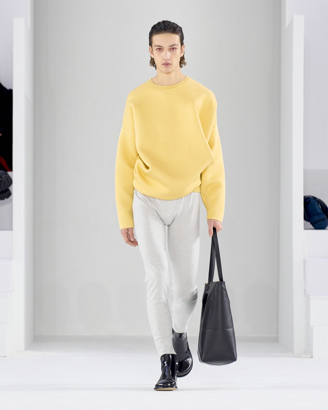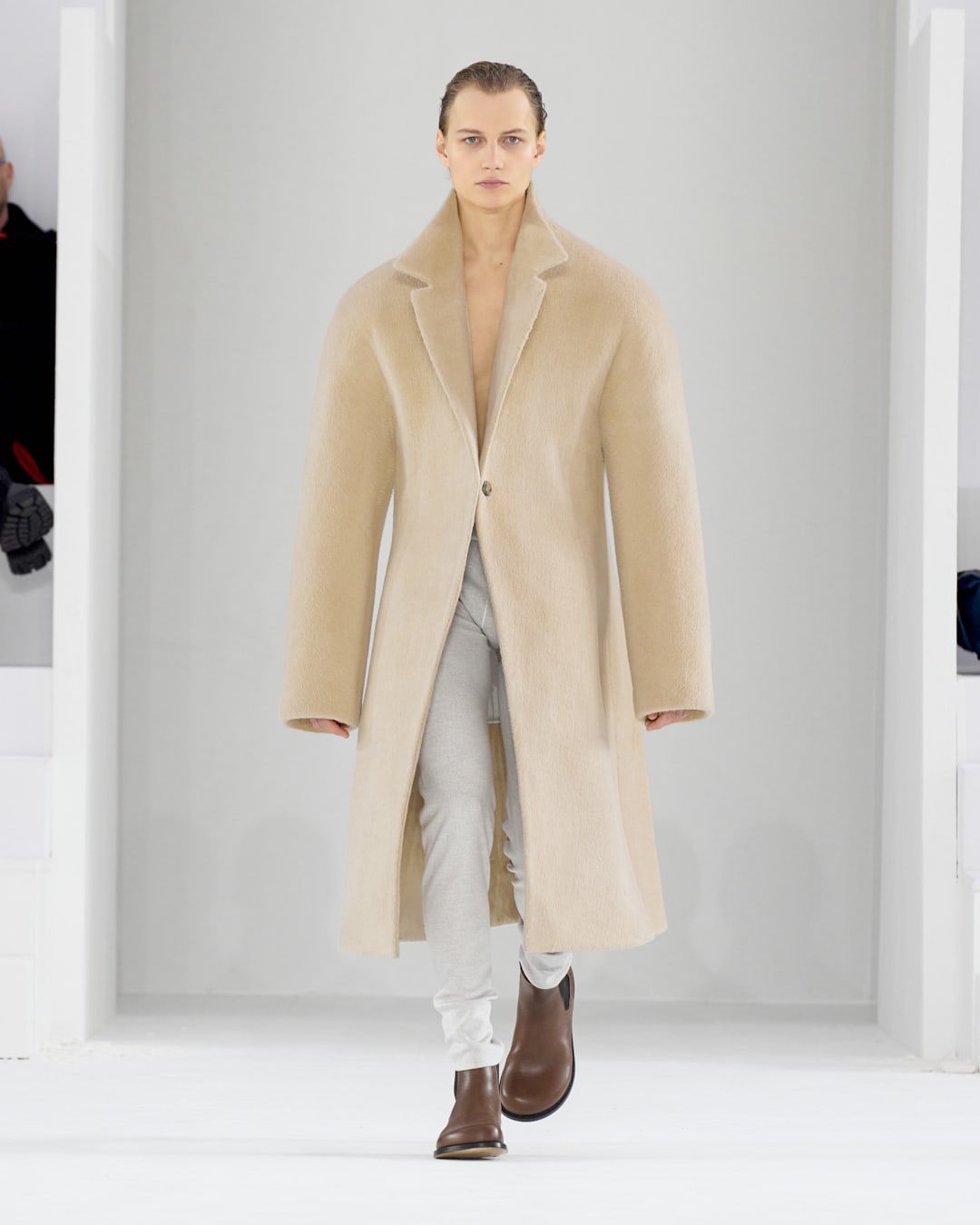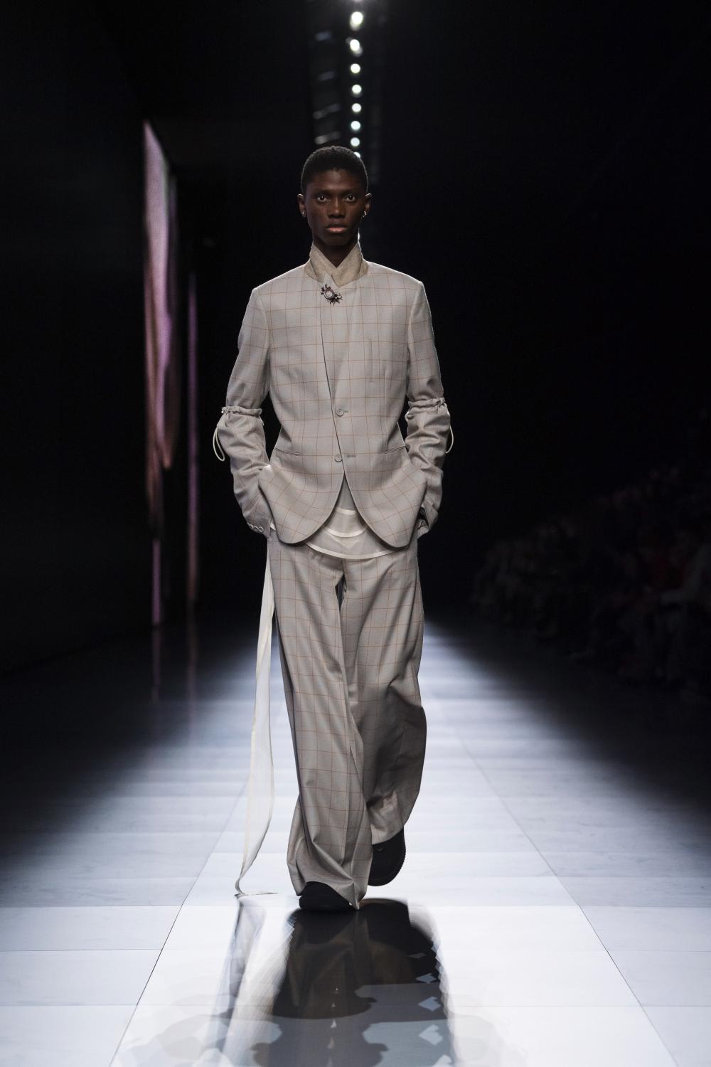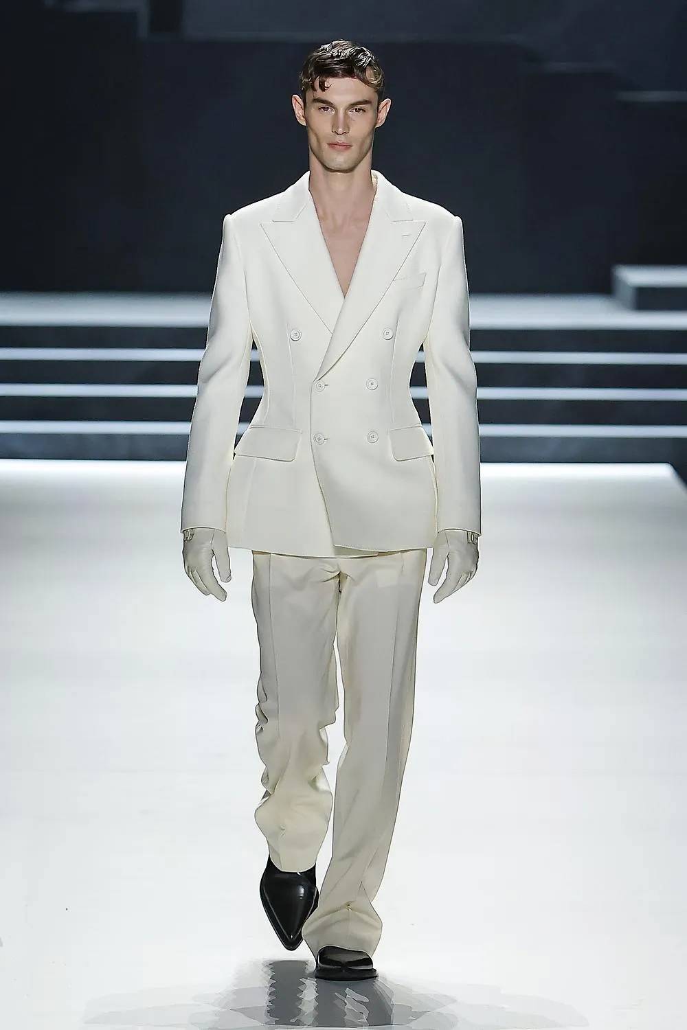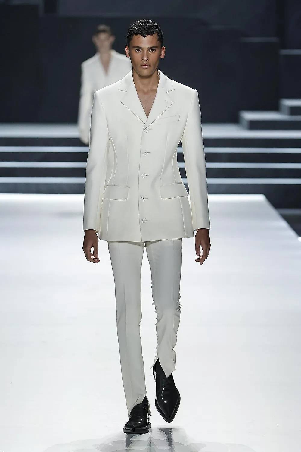 The label seems to have done a spring clean to reveal what is the true essence of a modern wardrobe for men: Shapely jackets, comfortable knitwear, fluid, sensual trousers that draw focus to the beautiful construction of the tailoring. And like a blank slate, the finale was punctuated with two perfect white crêpe suits, narrow waisted and curvaceous in the hip, as austere and pure as a South Sea pearl.