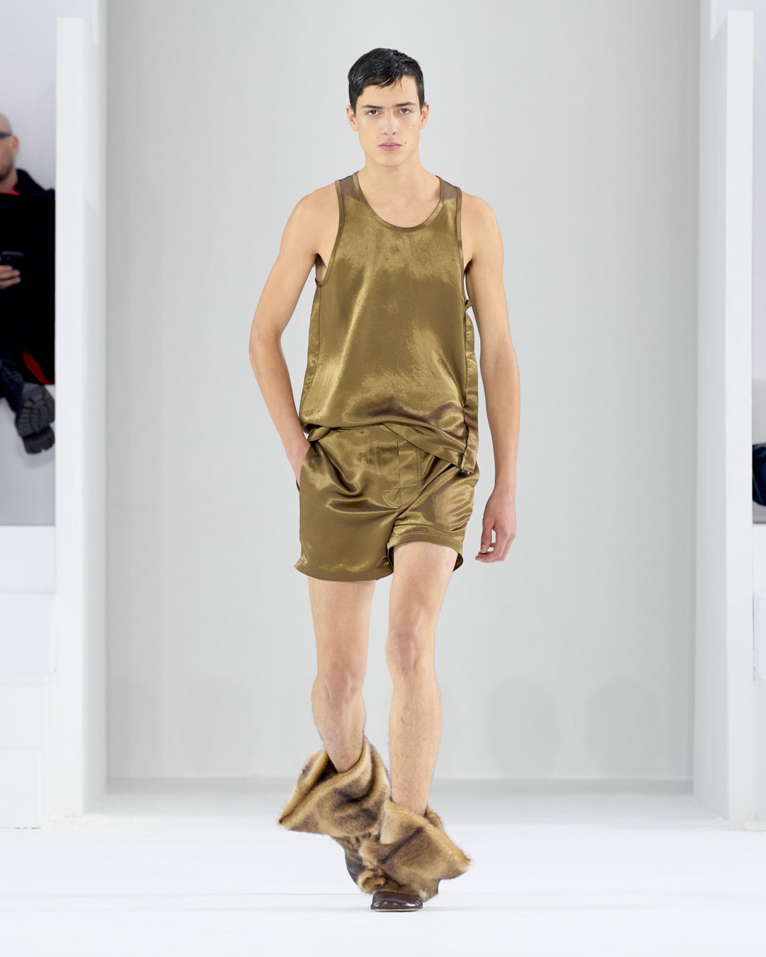 Fashion’s darling Jonathan Anderson presented a collection for Loewe so reduced and stripped away that ‘minimalist’ doesn’t quite come close to describing it. Although the clothes are utterly unadorned, there was a nakedness and purity that placed a clear focus on what each item of clothing was for: It’s like opening a dialogue box that says “Here’s a coat,” or “Here’s a pair of shorts”. The presentation, set up as a white cube (like a lab or a schoolroom), stripped away all the layers that fashion had accrued – the layers of perceived value, trend values, clickability, gender, age – to show you just what a sweater is, or what cashmere trousers are.