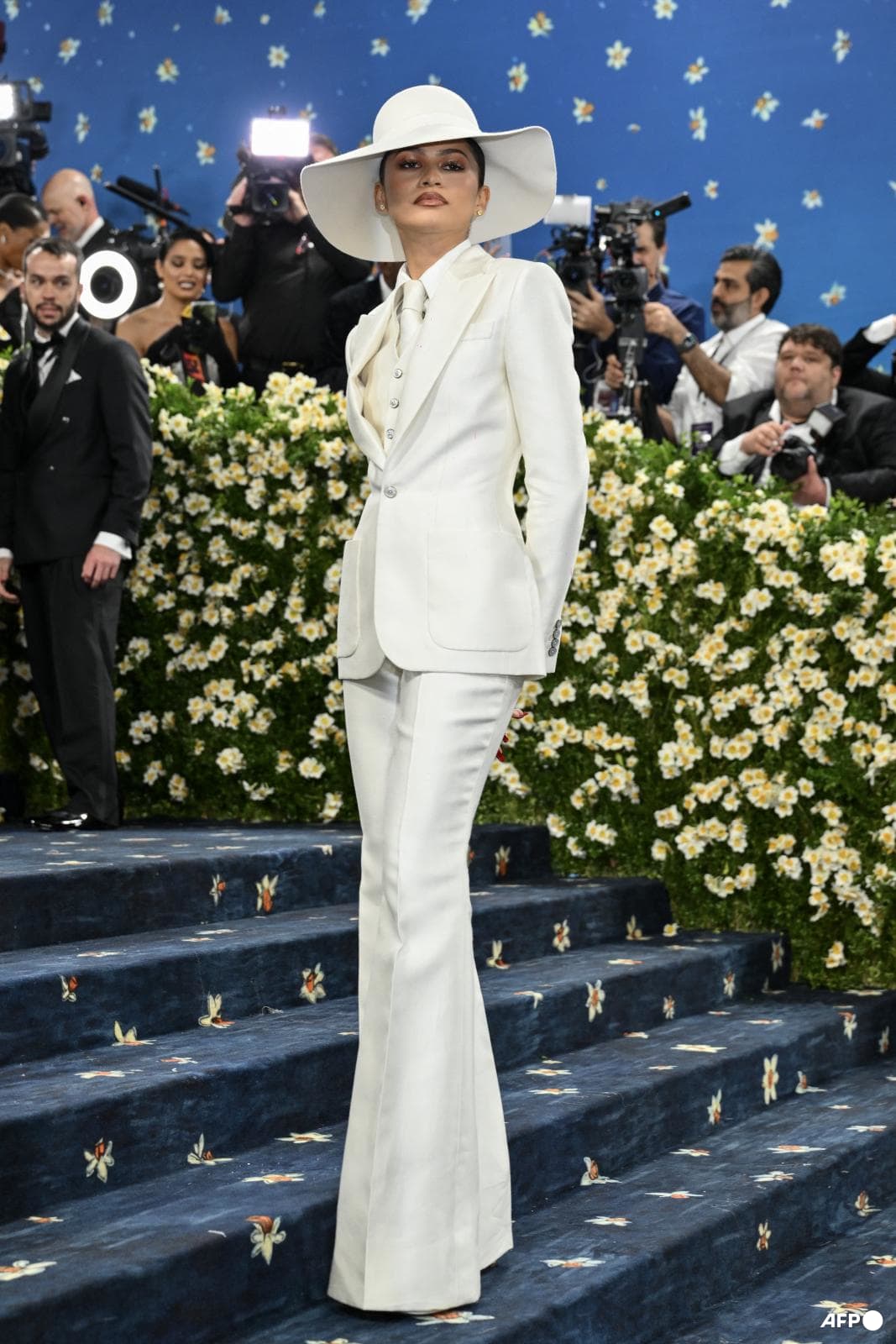 Zendaya opted for monochrome suited styling in an all-white Louis Vuitton ensemble.