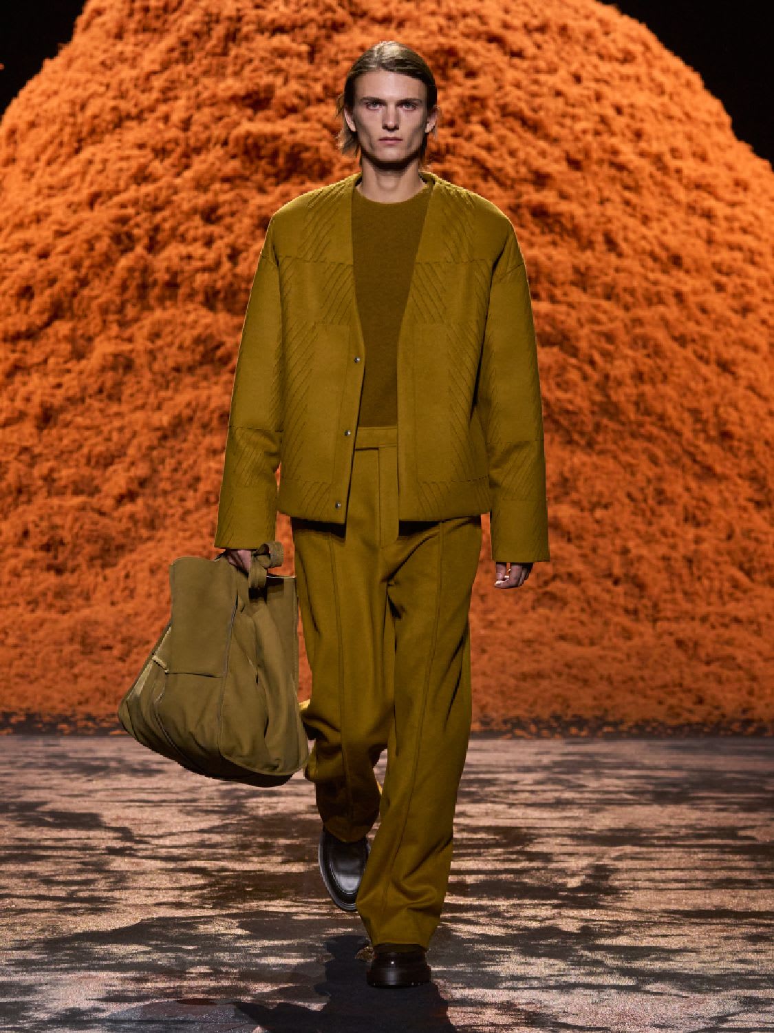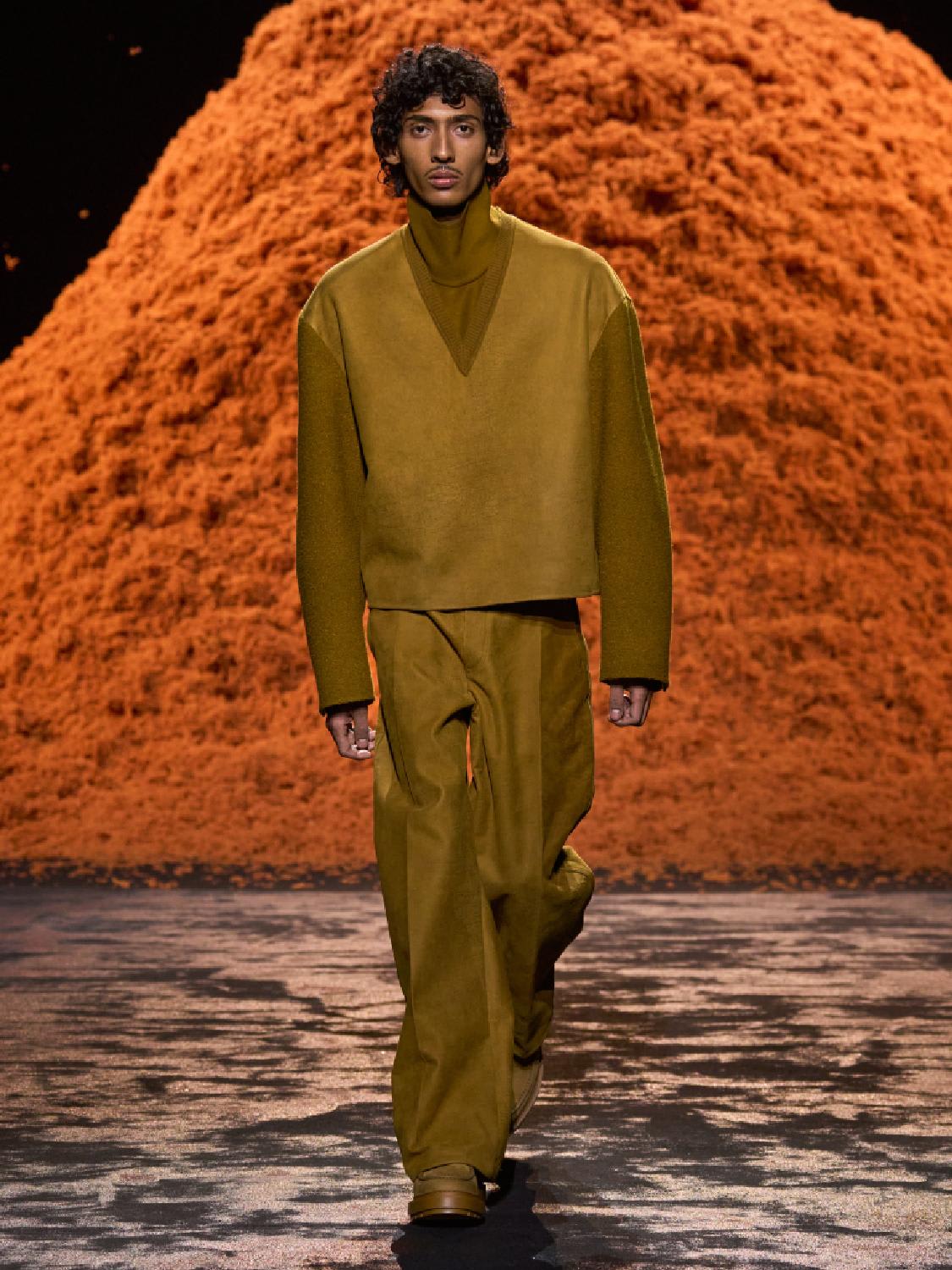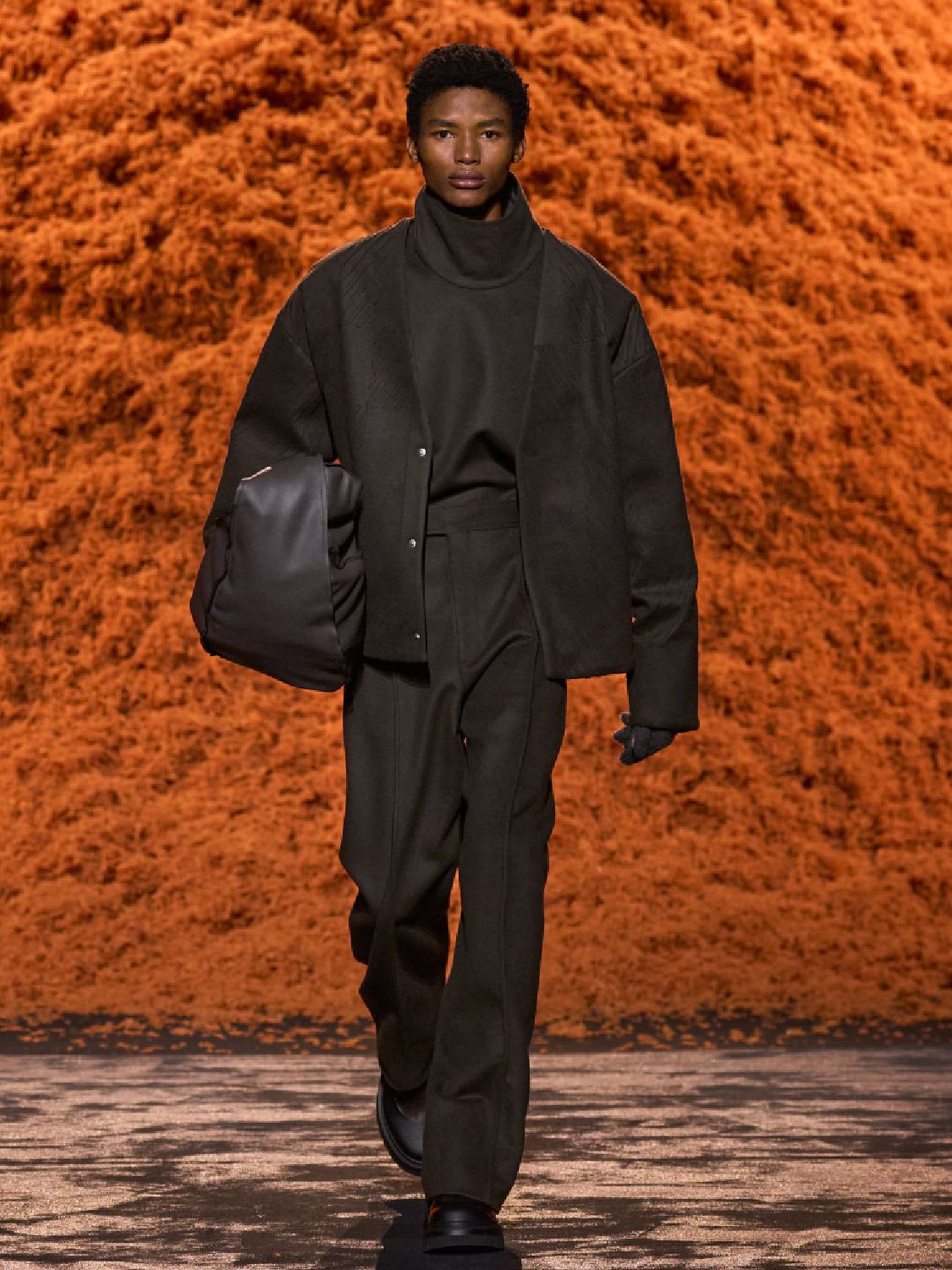 Zegna’s artistic director Alessandro Sartori, who has become synonymous with the fabric house, in aesthetic and in ethos, presents collections that address the reality of climate change. Sartori’s designs are a refined fusion of traditional tailoring and modern leisurewear, with a focus on lightness and sustainability, designs that evolve organically over the years, clothes with permanence sewn into its seams. In material, he uses innovative fabrics made from pre-existing sources and traceable fibres, such as the upcycled cashmere seen here. In looks subtle and unadorned, the unusual colour palette added zing in layers of earthy hues: Notes of cheeses and creams, pumpkin and butter and granito, foliage brown and petrol blue, bursts of pink in soothing amalgamations. These are the civilised and sophisticated clothes that the world needs more of.