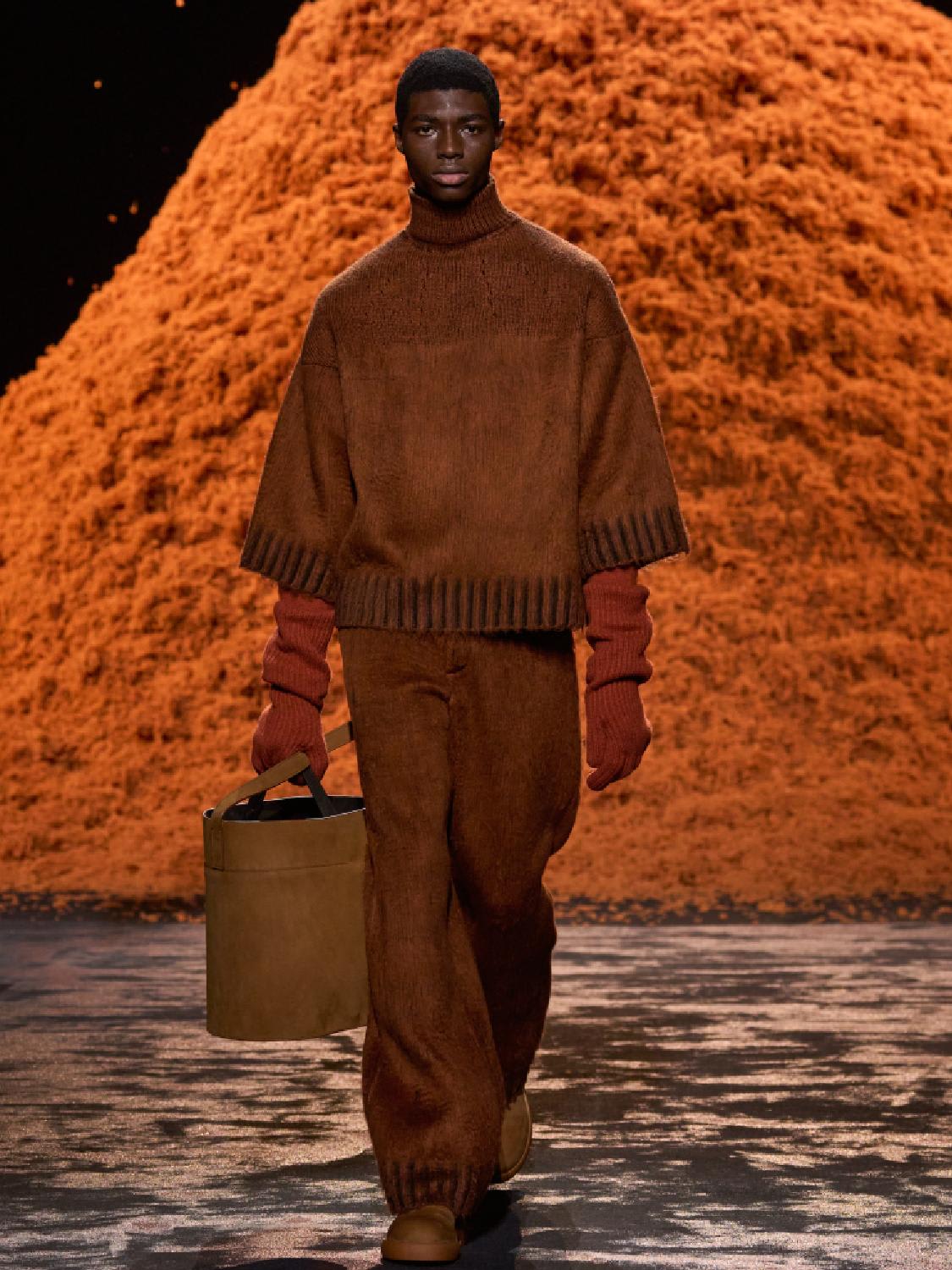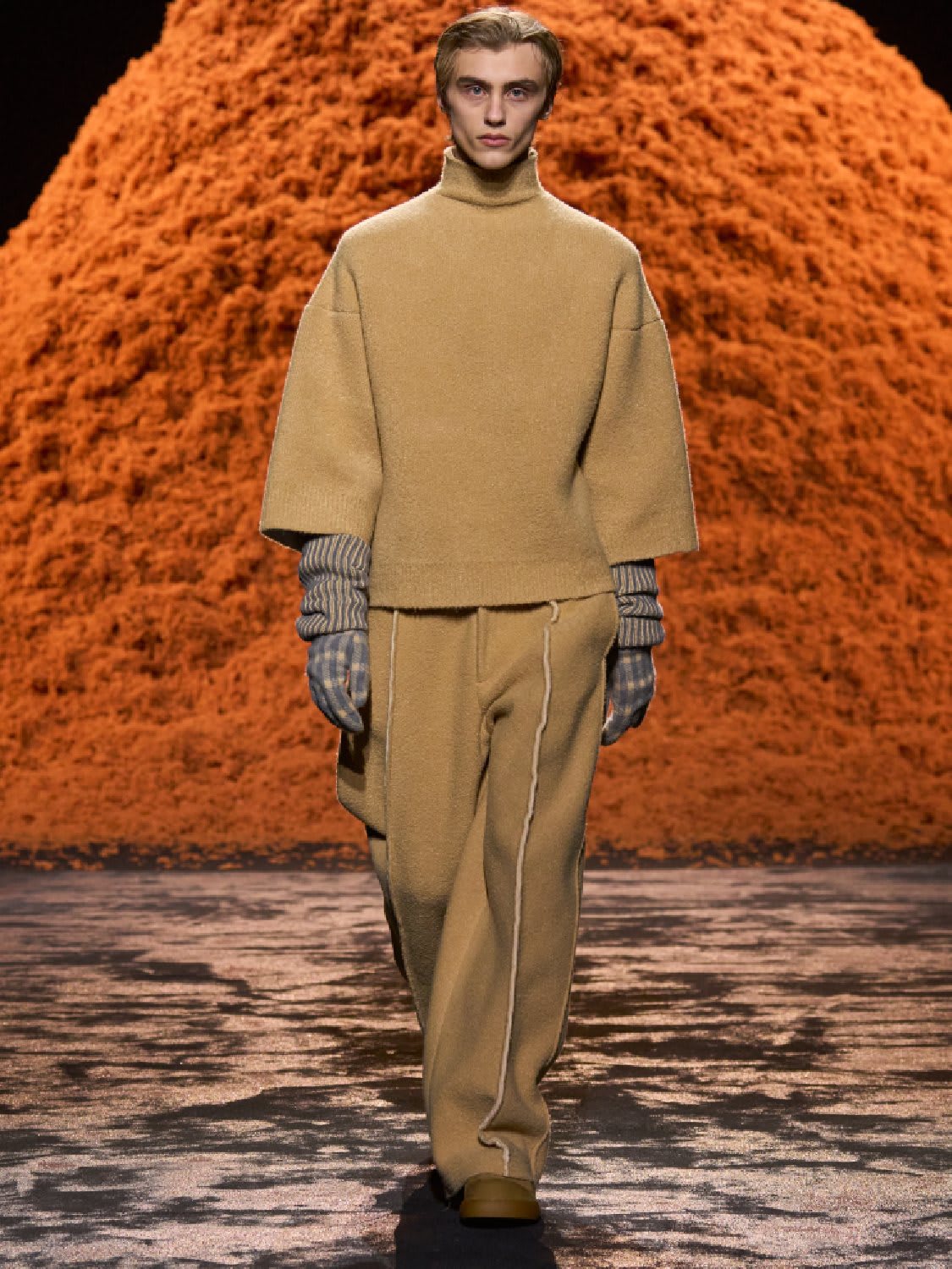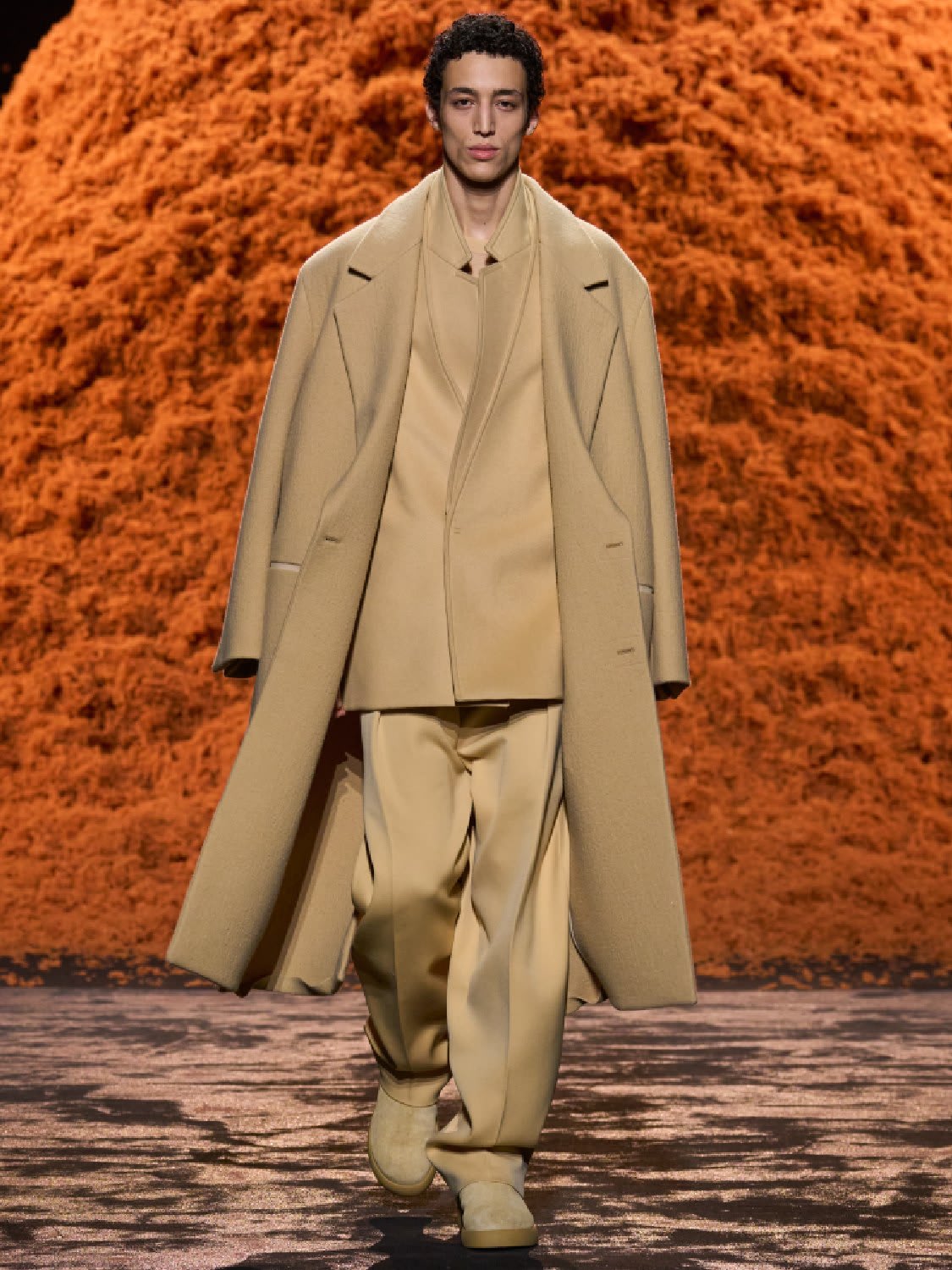 Zegna’s artistic director Alessandro Sartori, who has become synonymous with the fabric house, in aesthetic and in ethos, presents collections that address the reality of climate change. Sartori’s designs are a refined fusion of traditional tailoring and modern leisurewear, with a focus on lightness and sustainability, designs that evolve organically over the years, clothes with permanence sewn into its seams. In material, he uses innovative fabrics made from pre-existing sources and traceable fibres, such as the upcycled cashmere seen here. In looks subtle and unadorned, the unusual colour palette added zing in layers of earthy hues: Notes of cheeses and creams, pumpkin and butter and granito, foliage brown and petrol blue, bursts of pink in soothing amalgamations. These are the civilised and sophisticated clothes that the world needs more of.