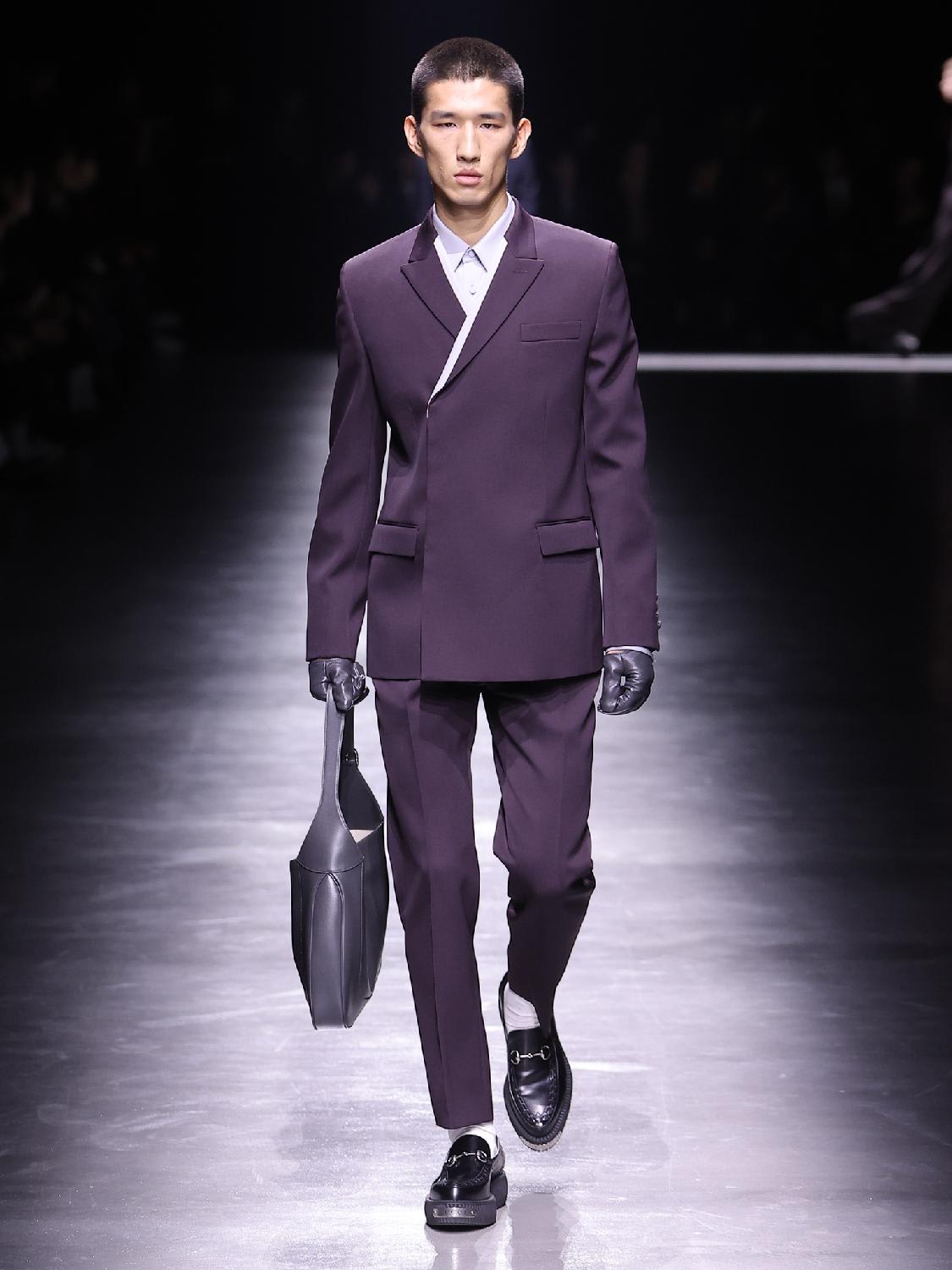 The menswear further developed and polished that basic idea of a spring-clean, leaving nothing but a sumptuous study of very accomplished wardrobe basics, beautifully judged in shape and sharply tailored in sumptuous fabrics. De Sarno’s menswear was a strong restatement of what “quiet luxury” must look like, offering expressions of the classic man’s wardrobe that appeals to sophisticated customers. Make no mistake, this is very much a client-centric, retail-friendly take on fashion: Handsome swaggering coats of all lengths, in wool or leather, many in a modest grey (when was the last time you saw a plain grey coat at Gucci – plain, and so grey); immaculate suits sans buttons in brown and blues, sweaters and hoodies and suchlike practicalities in monochromatic monoliths, all the better to bring focus on the extra-large Jackie Bag in delicious glazed leathers in olive verdi, caramello and oxblood.