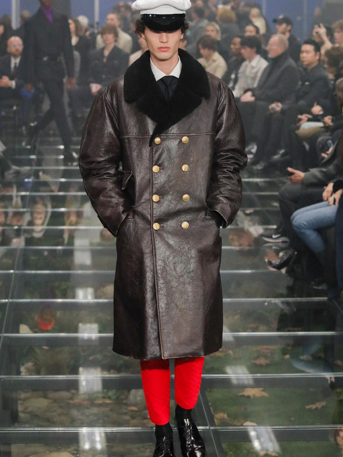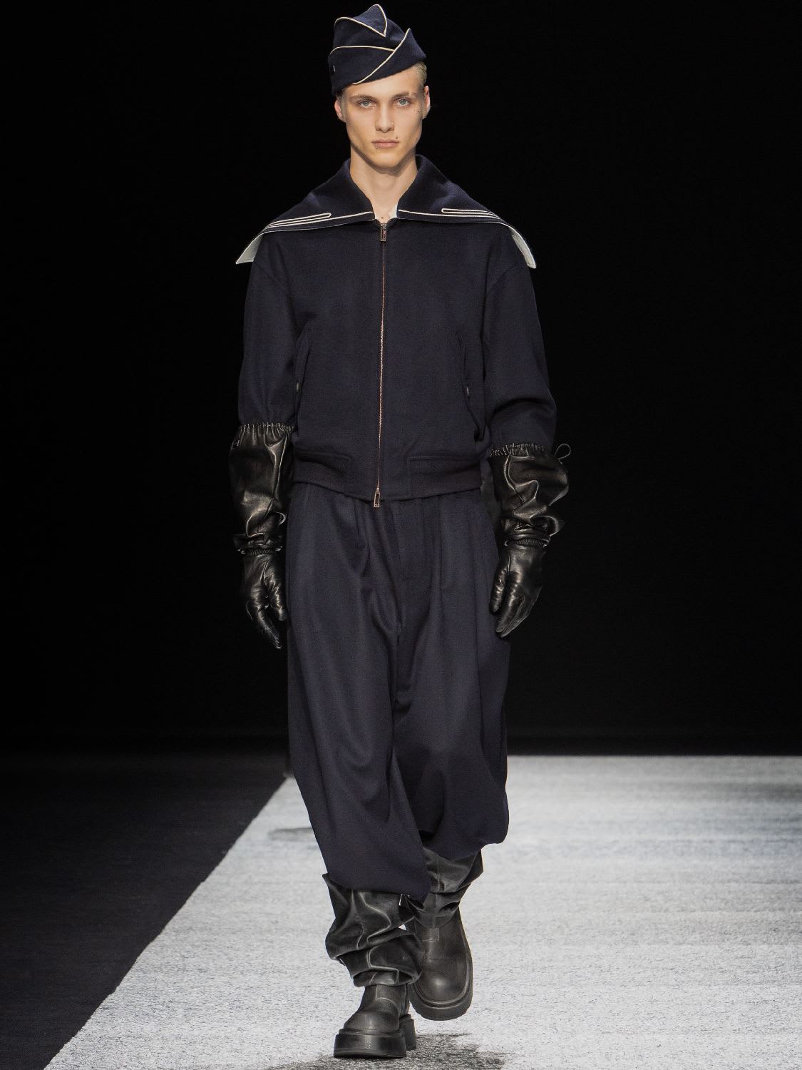 Updated in endless array, jackets, trousers, and great coats with generous volumes, sailor jackets, gilets and peacoats have a raffish sea captain charm. Shirts are replaced by tops in the same fabrics as blazers in a new uniform that feels decisive and authoritative. Utility garments such as dungarees and work shirts nod to the “athleisure” genre, unadorned, save for snaps, zips, flaps and sailor charm, while the ever-present sharply tailored work suits in tweed, pinstriping and flocking, always in a single colour, cater to the gentlemen office worker. Keeping this 100-plus look collection cohesive is the restrained palette: A wine-dark mix of navy blue, steel grey, ice white and midnight black, as sombre, and ominous as a gathering of the clouds of war.