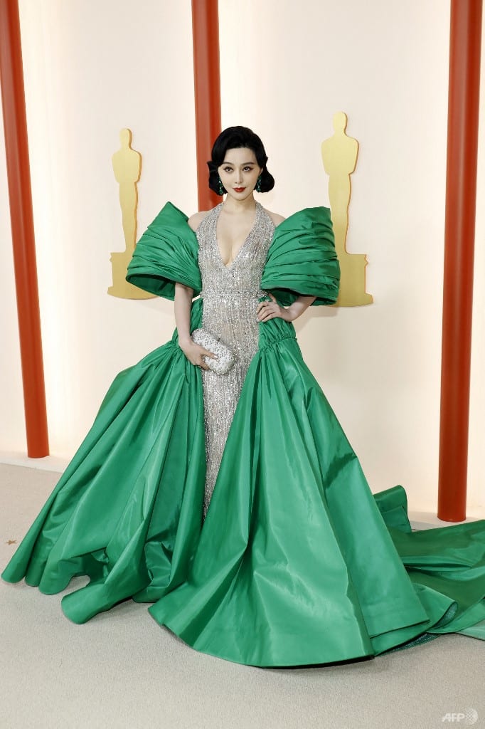 The Chinese actress made a rare appearance at the Oscars, donning a sequinned Tony Ward couture gown with an emerald cape and dramatic sleeves. She finished the look with emerald Lorraine Schwartz earrings.
